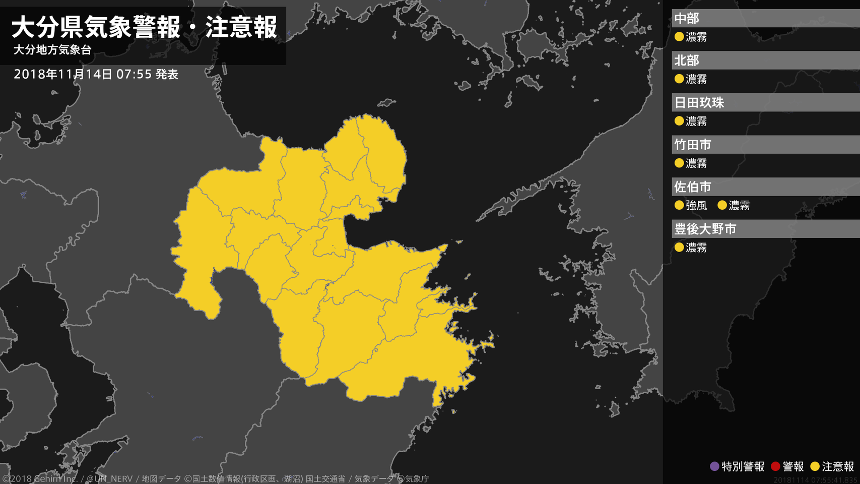 【大分県 気象警報・注意報 2018年11月14日 07:55】