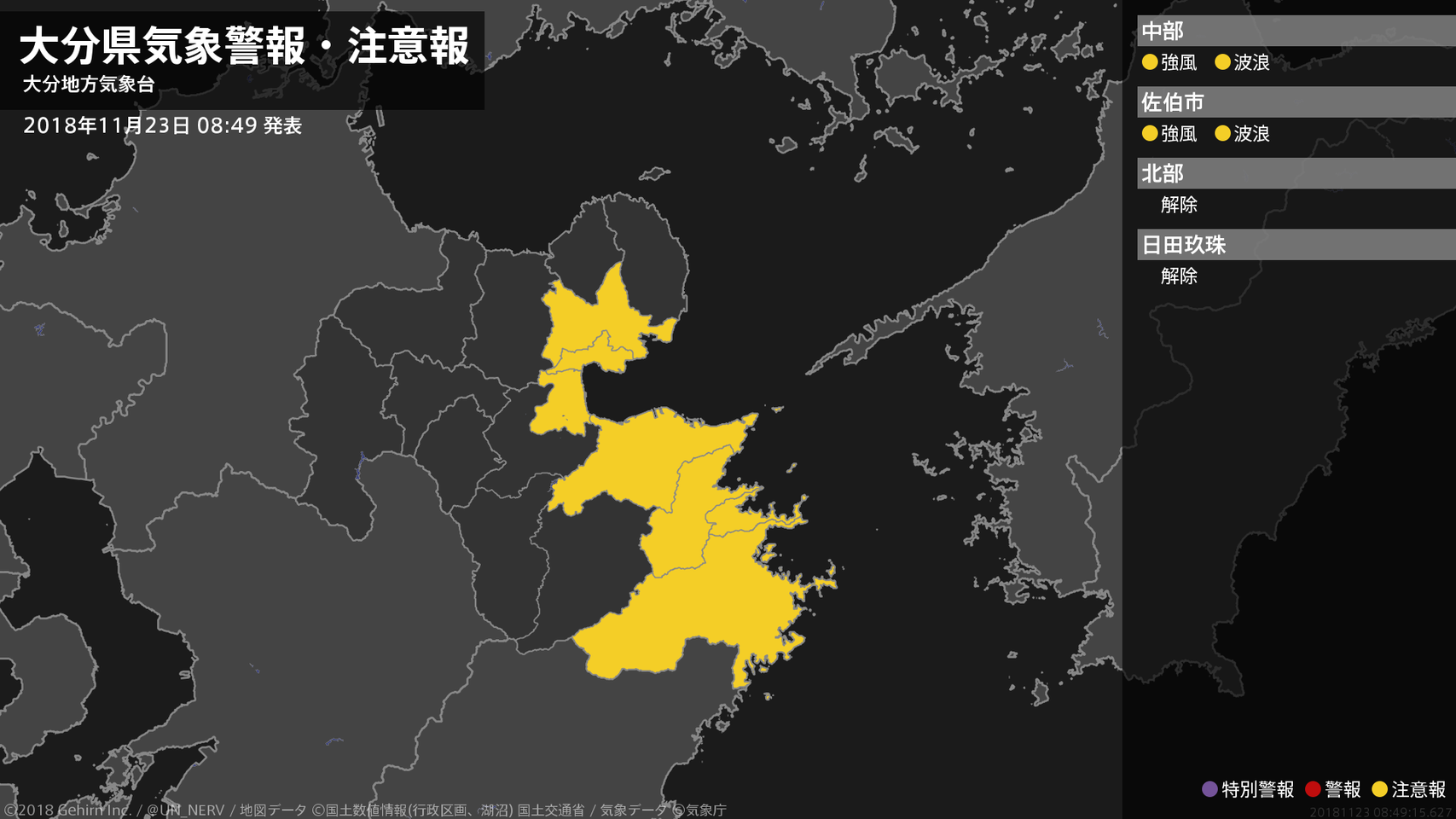 【大分県 気象警報・注意報 2018年11月23日 08:49】