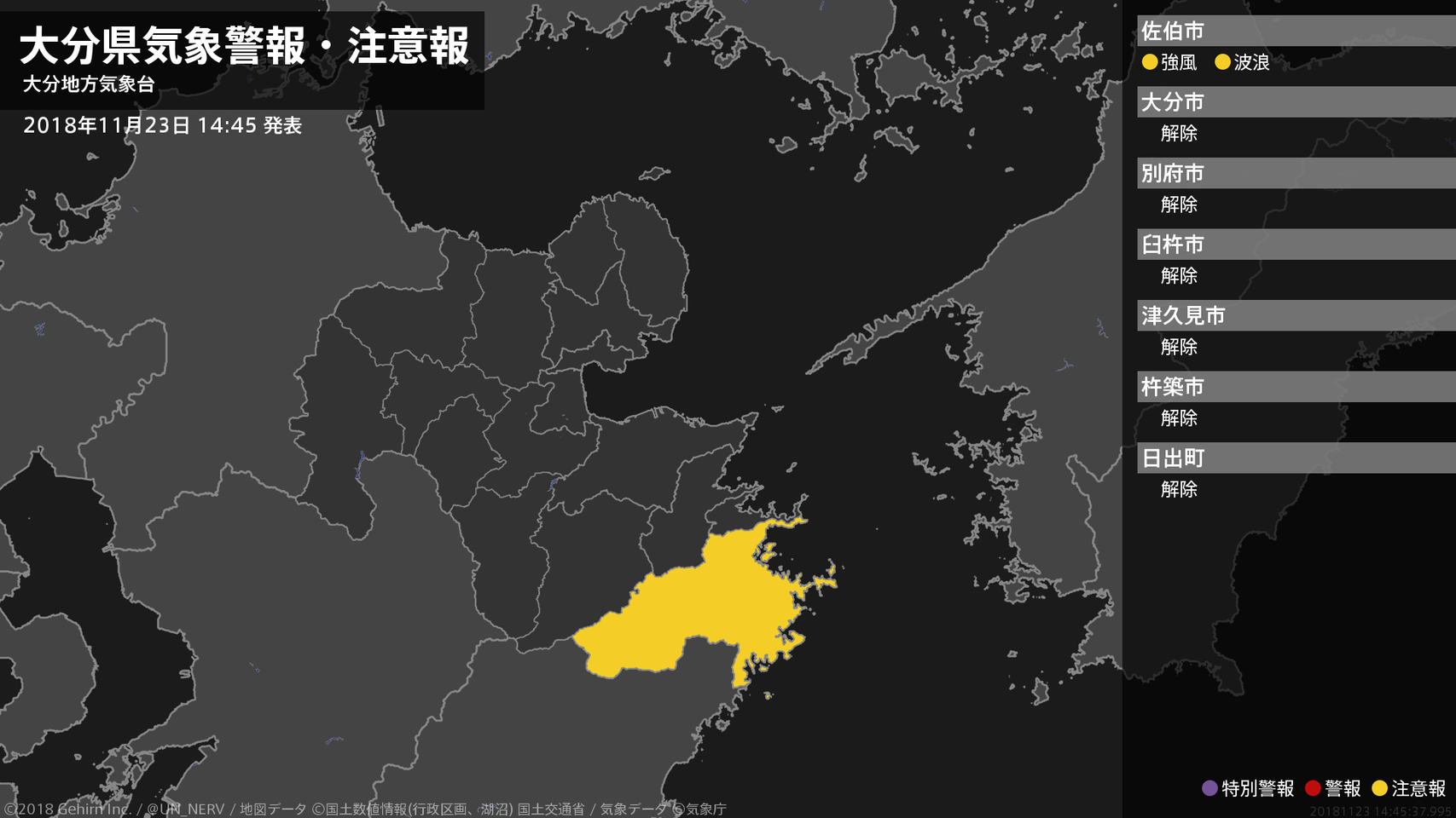【大分県 気象警報・注意報 2018年11月23日 14:45】