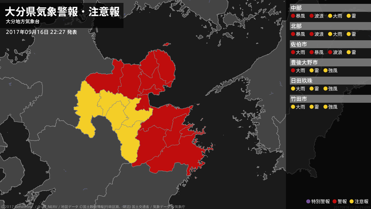 【大分県 気象警報 2017年09月16日 22:29】南部では、17日夜のはじめ頃まで土砂災害に警戒してください。中部、北部、南部では、17日明け方から17日夜のはじめ頃まで暴風や高波に警戒してください。#気象警報 #気象警報注意報 #大分県