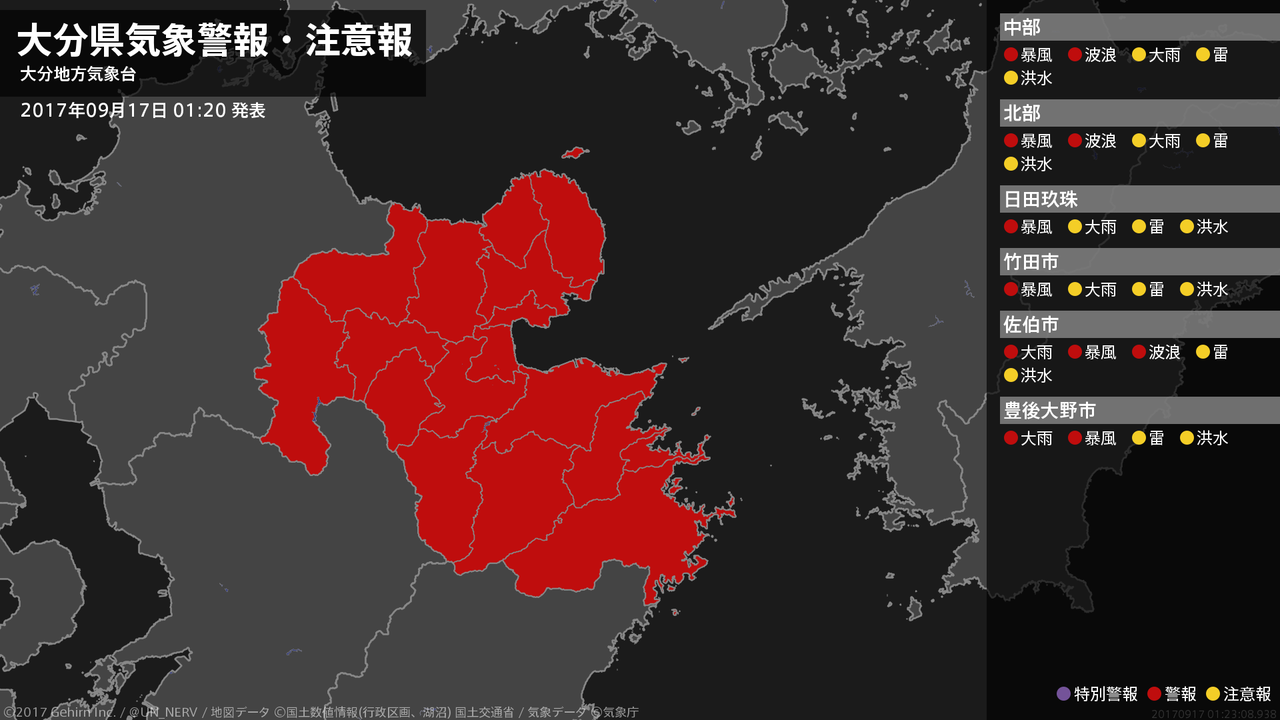 【大分県 気象警報 2017年09月17日 01:23】南部では、土砂災害に警戒してください。大分県では、暴風に警戒してください。中部、北部、南部では、高波に警戒してください。#気象警報 #気象警報注意報 #大分県