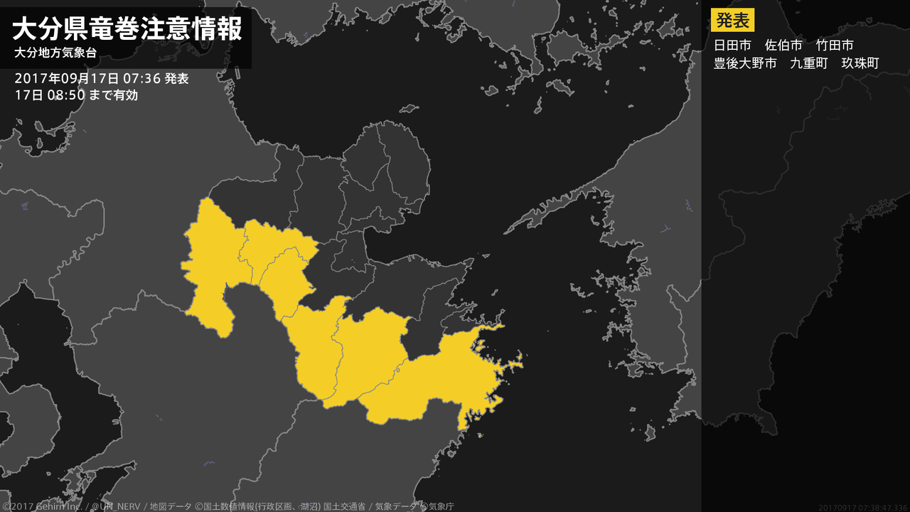 【大分県 竜巻注意情報】大分県は、竜巻などの激しい突風が発生しやすい気象状況になっています。頑丈な建物内に移動するなど安全確保に努めてください。この情報は17日08:50まで有効です。#竜巻注意情報 #大分県