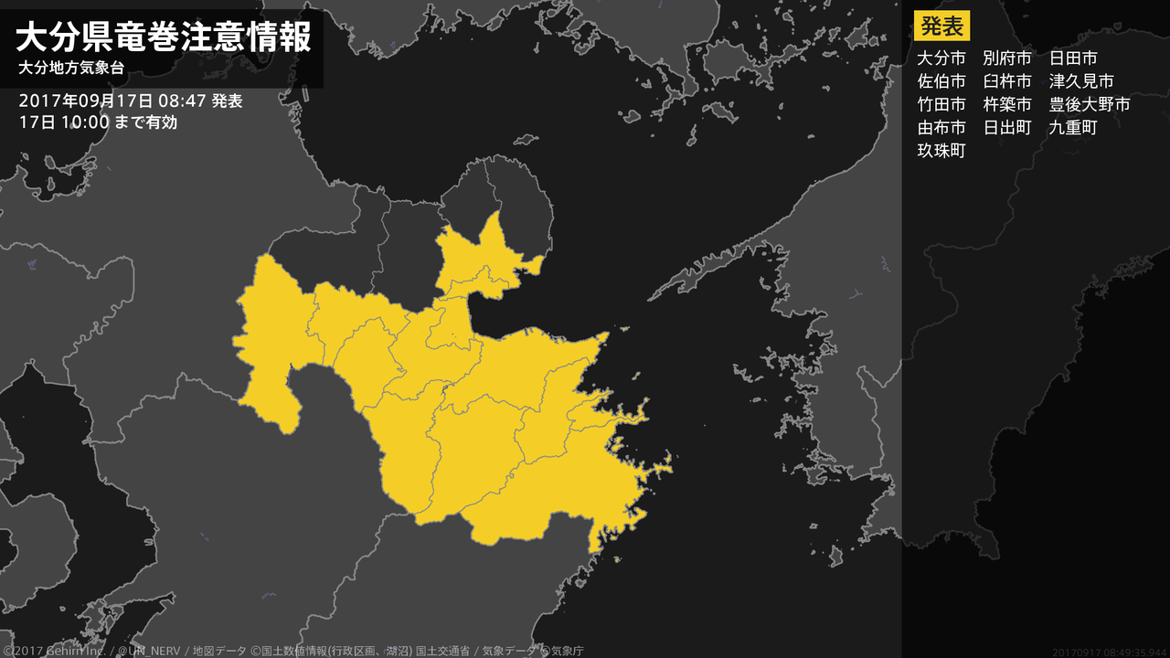 【大分県 竜巻注意情報】大分県は、竜巻などの激しい突風が発生しやすい気象状況になっています。頑丈な建物内に移動するなど安全確保に努めてください。この情報は17日09:00まで有効です。#竜巻注意情報 #大分県