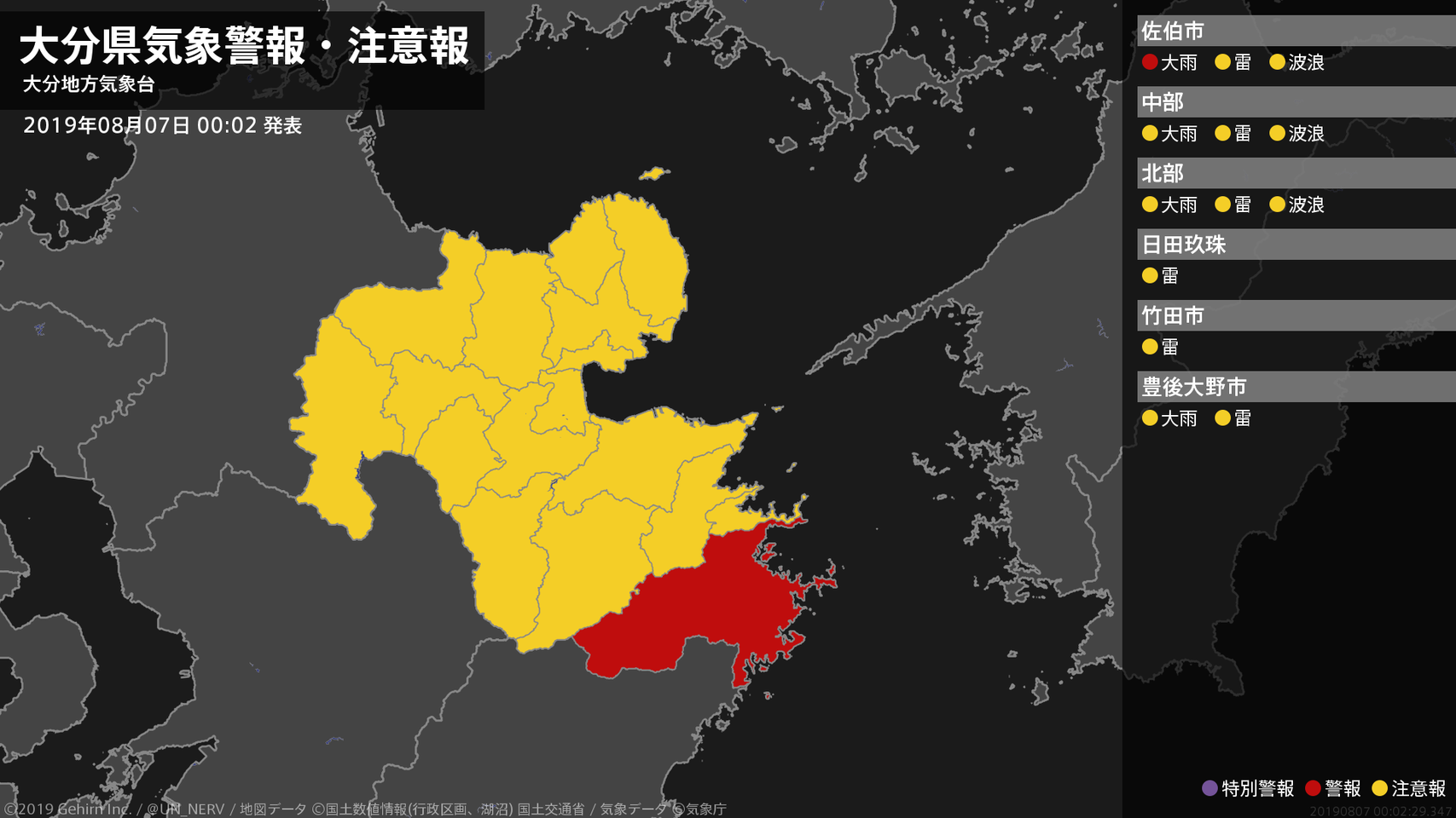 【大分県 気象警報 2019年08月07日 03:27】中部、南部では、7日朝まで土砂災害に警戒してください。#気象警報 #気象警報注意報 #大分県