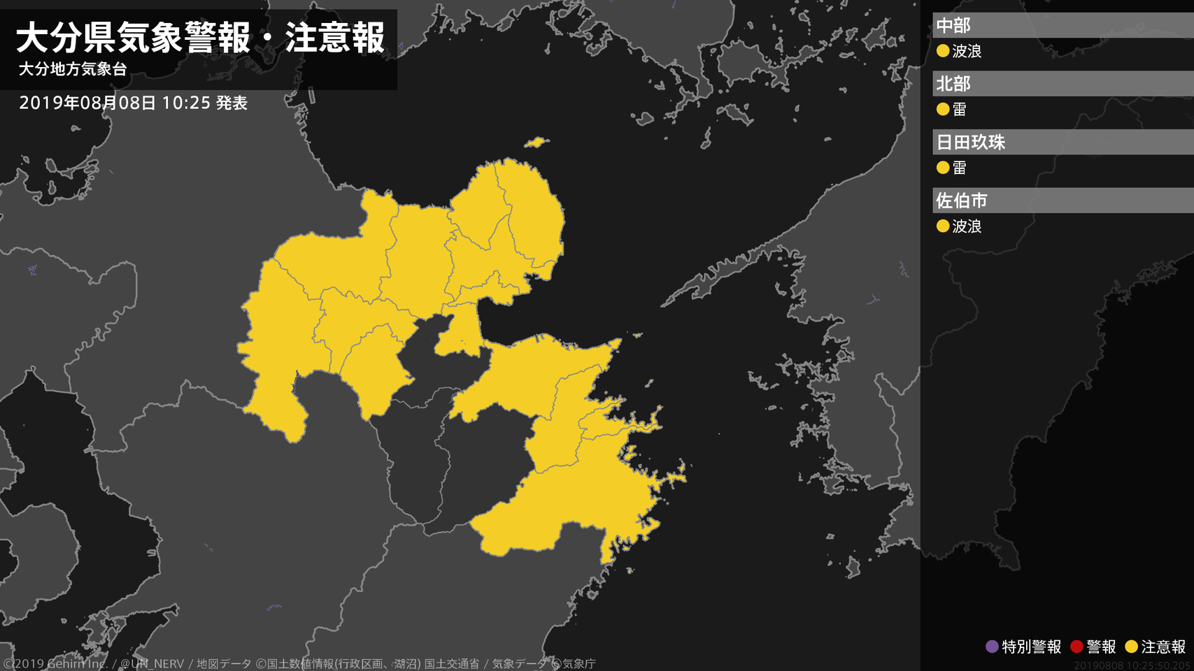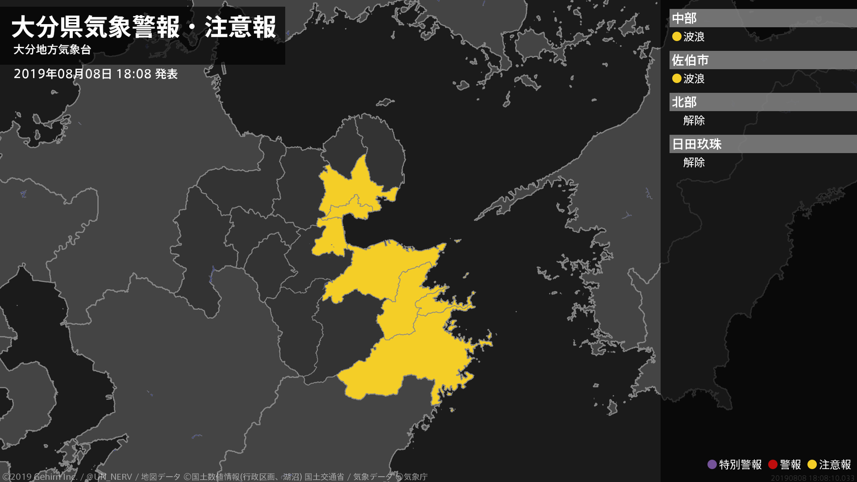 【大分県 気象警報・注意報 2019年08月08日 18:08】中部、南部では、高波に注意してください。#気象警報注意報 #大分県
