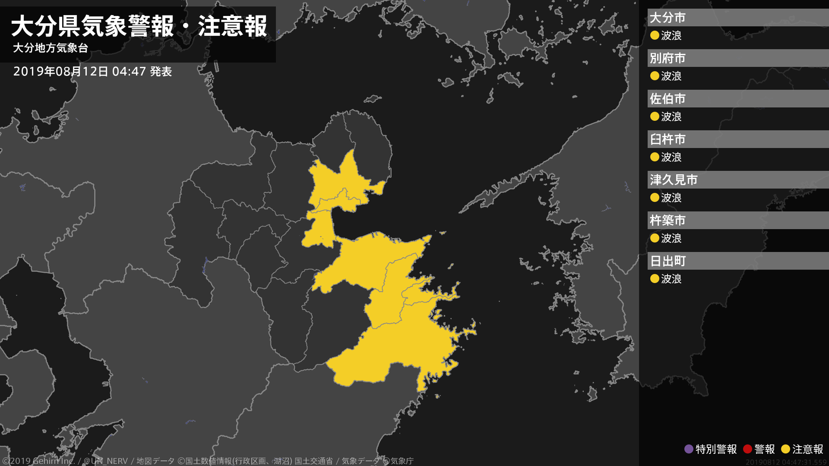 【大分県 気象警報・注意報 2019年08月12日 04:47】中部、南部では、高波に注意してください。#気象警報注意報 #大分県
