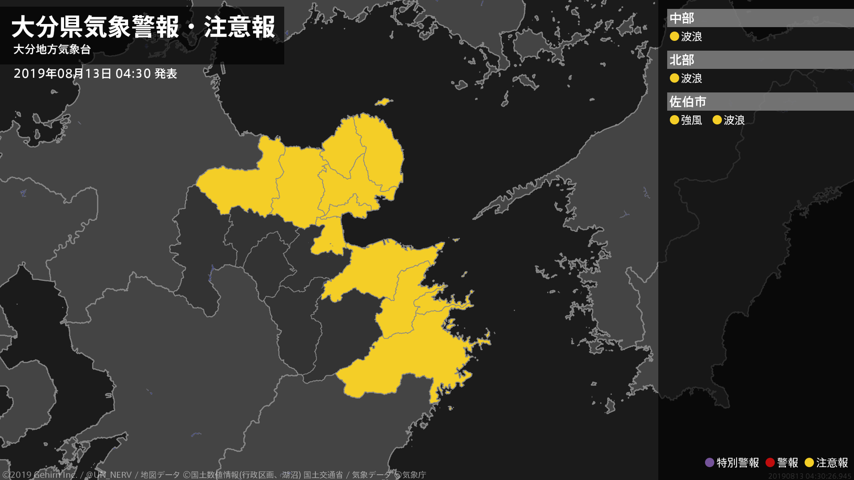 【大分県 気象警報・注意報 2019年08月13日 04:30】南部では、強風に注意してください。中部、北部、南部では、高波に注意してください。#気象警報注意報 #大分県