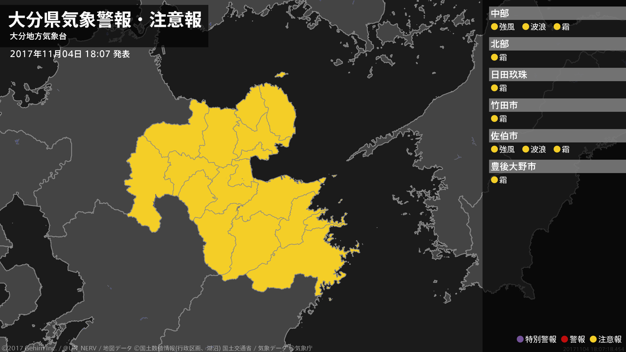 【大分県 気象警報・注意報 2017年11月04日 18:07】中部、南部では、4日夜遅くまで強風や高波に注意してください。大分県では、5日朝は霜に対する農作物の管理に注意してください。#気象警報注意報 #大分県