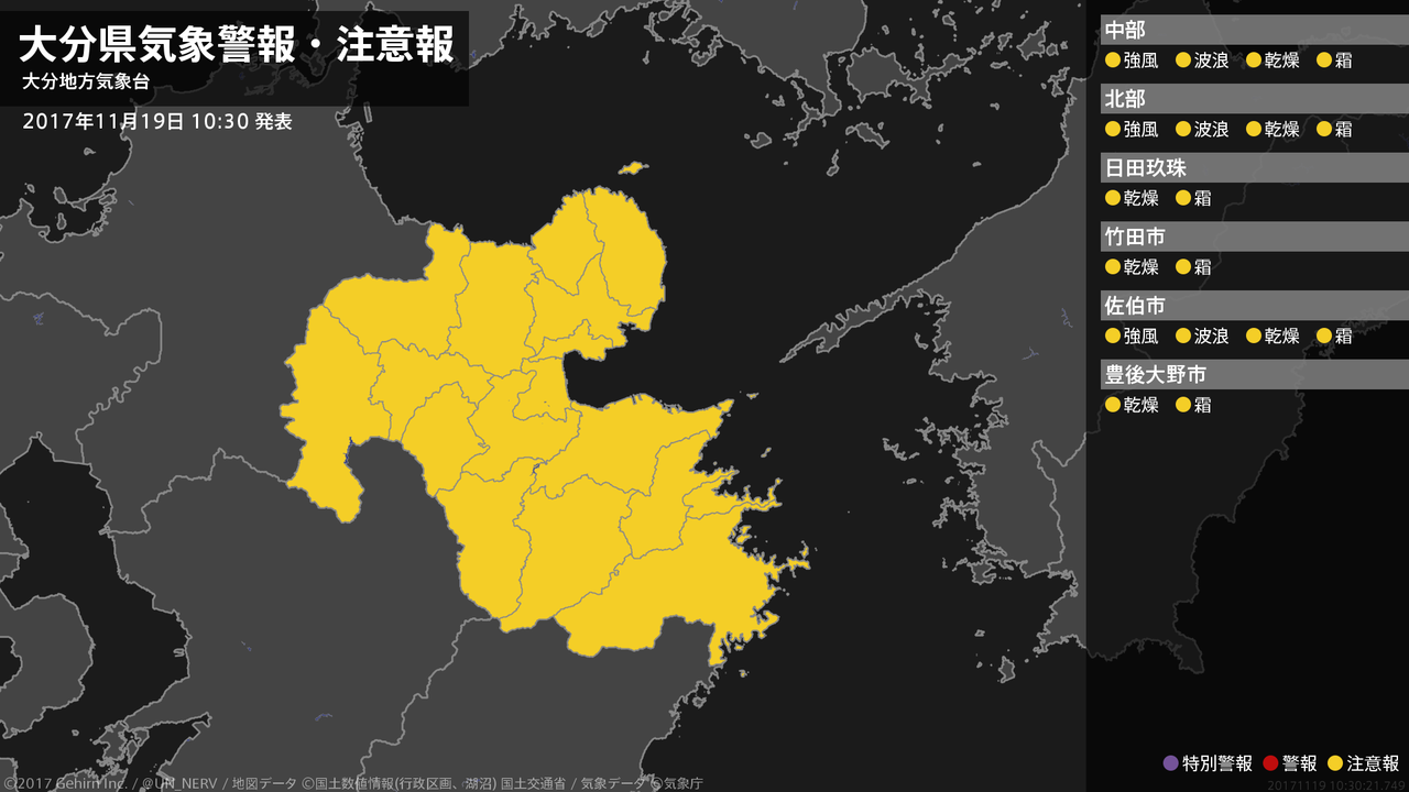 【大分県 気象警報・注意報 2017年11月19日 10:30】中部、北部、南部では、19日夕方まで強風や高波に注意してください。大分県では、20日まで空気の乾燥による火の取り扱いに、20日朝は霜に対する農作物の管理に注意してください。#気象警報注意報 #大分県