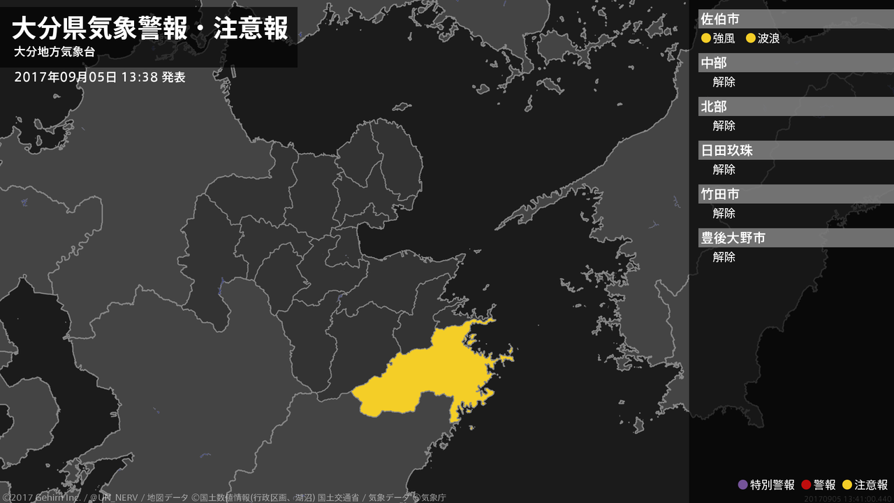 【大分県 気象警報・注意報 2017年09月05日 21:47】注意報を解除します。#気象警報注意報 #大分県