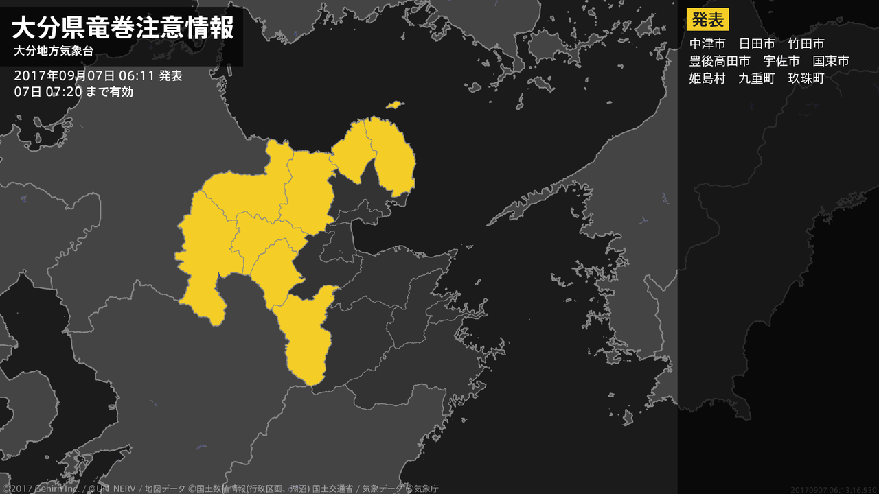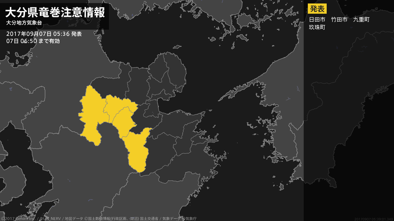 【大分県 気象警報・注意報 2017年09月06日 16:52】大分県では、7日未明から7日夕方まで竜巻などの激しい突風や急な強い雨、落雷に注意してください。#気象警報注意報 #大分県