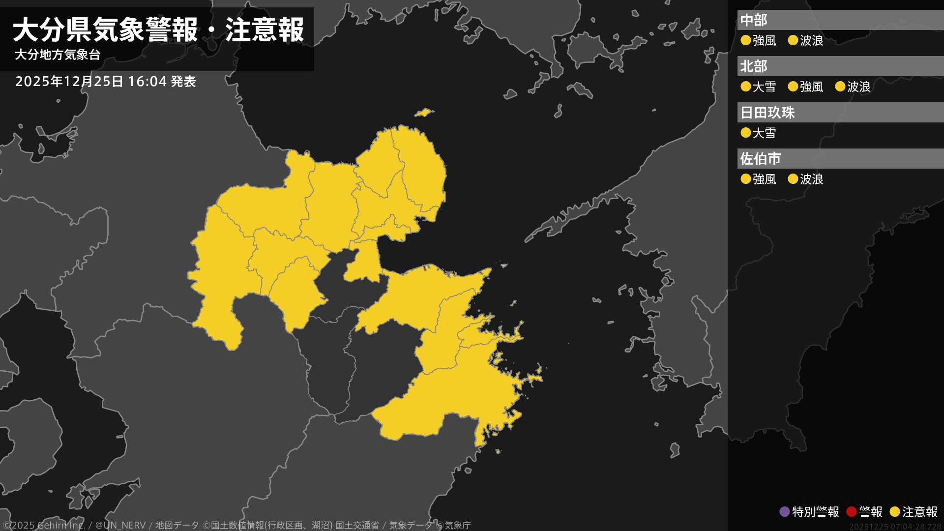 【大分県 気象警報・注意報 2025年12月25日 16:04】中部、北部、南部では、強風や高波に注意してください。北部、西部では、大雪に注意してください。#気象警報注意報 #大分県