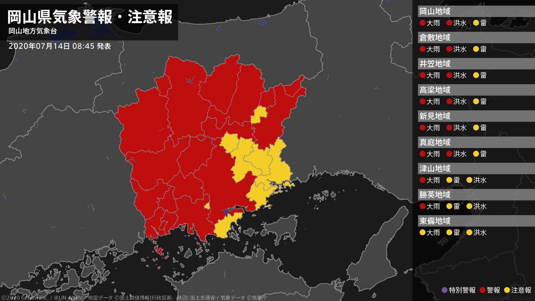 【岡山県 気象警報 2020年07月14日 08:45】岡山県では、14日昼前まで土砂災害に警戒してください。北部では14日昼前まで、南部では14日夕方まで、河川の増水に警戒してください。#気象警報 #気象警報注意報 #岡山県