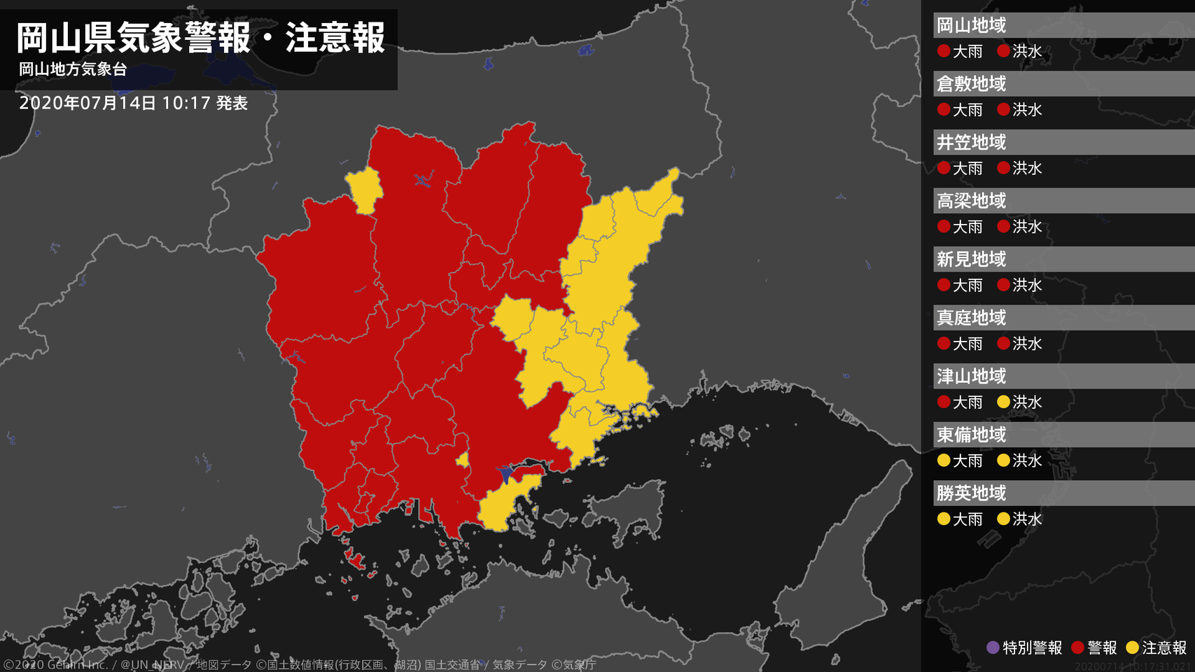 【岡山県 気象警報 2020年07月14日 10:17】北部では14日昼前まで、南部では14日昼過ぎまで、土砂災害に警戒してください。岡山県では、14日夕方まで河川の増水に警戒してください。#気象警報 #気象警報注意報 #岡山県