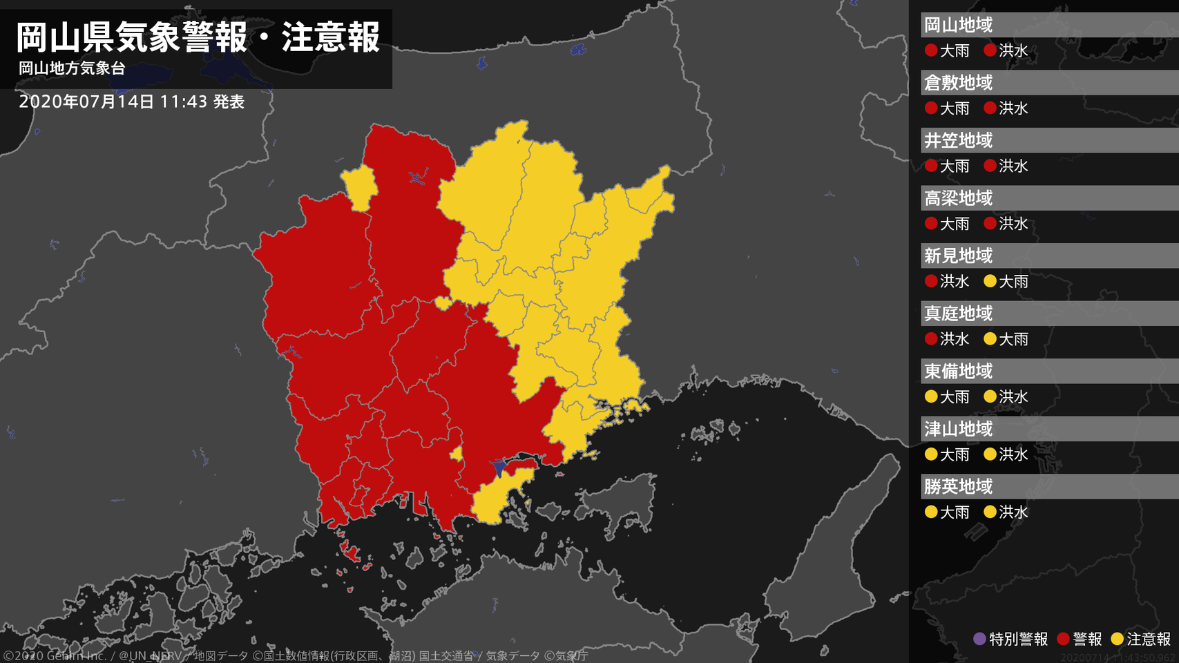 【岡山県 気象警報 2020年07月14日 11:43】南部では、14日昼過ぎまで土砂災害に警戒してください。岡山県では、14日夕方まで河川の増水に警戒してください。#気象警報 #気象警報注意報 #岡山県