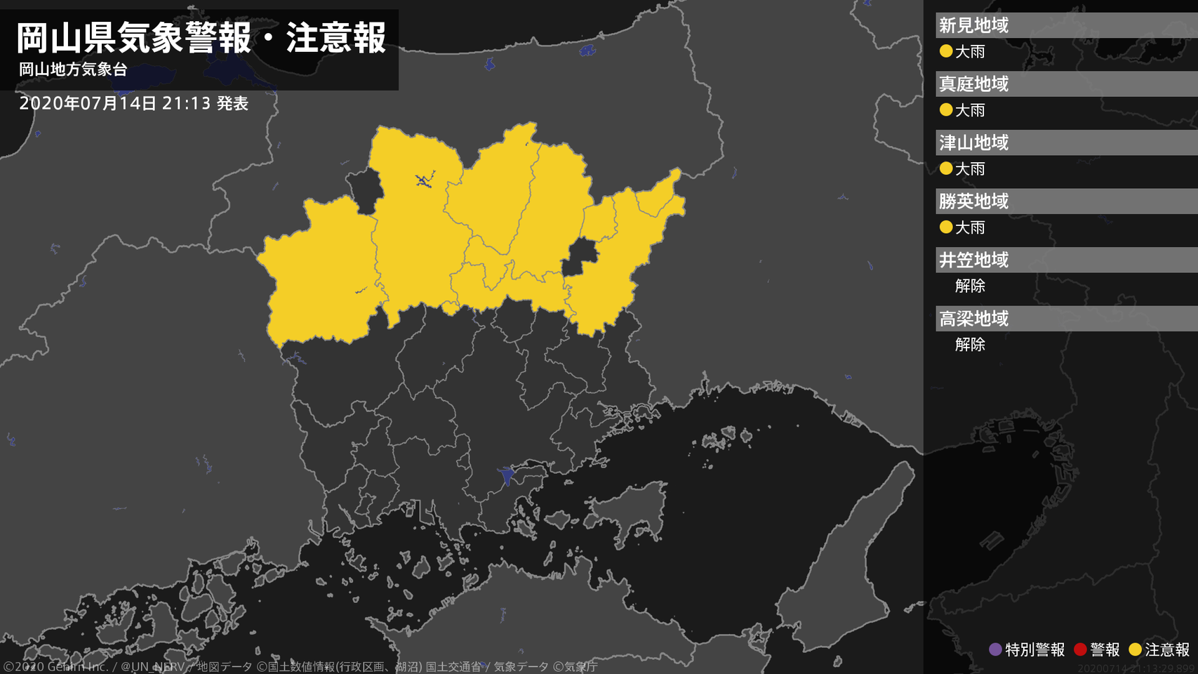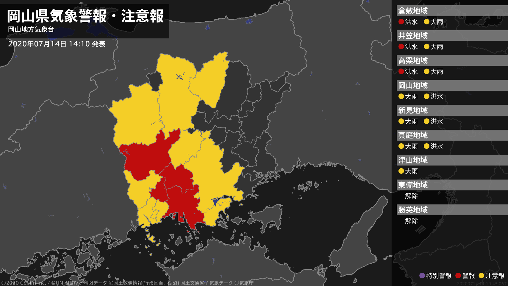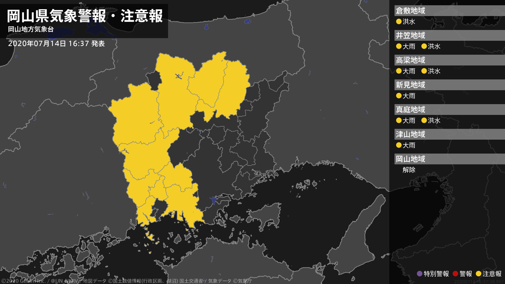 【岡山県 気象警報(解除) 2020年07月14日 16:37】岡山県に発表されていた気象警報はすべて解除されました。#気象警報 #岡山県