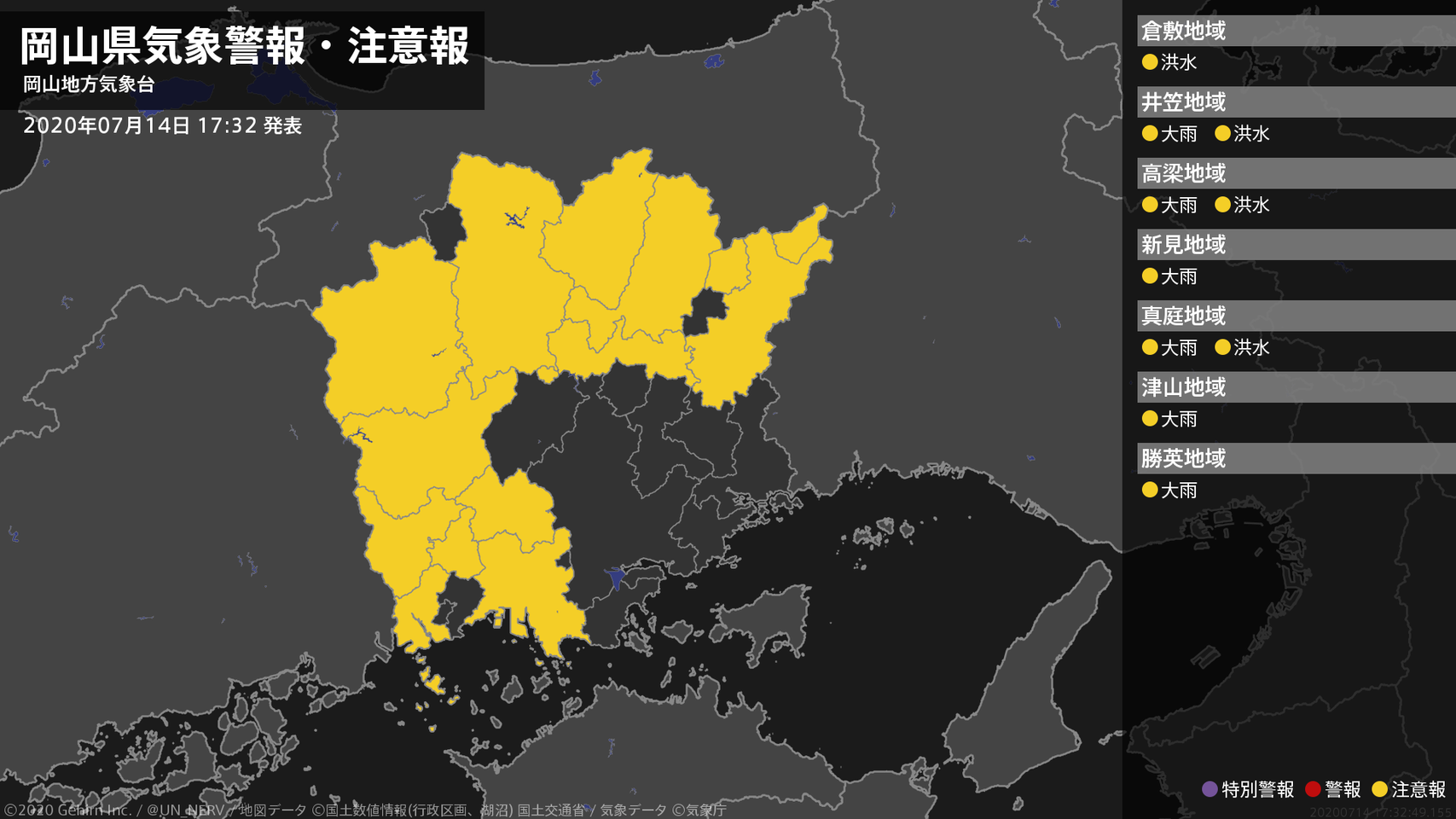 【岡山県 気象警報・注意報 2020年07月14日 17:32】南部では14日夜のはじめ頃まで、北部では15日昼前まで、土砂災害に注意してください。岡山県では、14日夜遅くまで河川の増水に注意してください。#気象警報注意報 #岡山県
