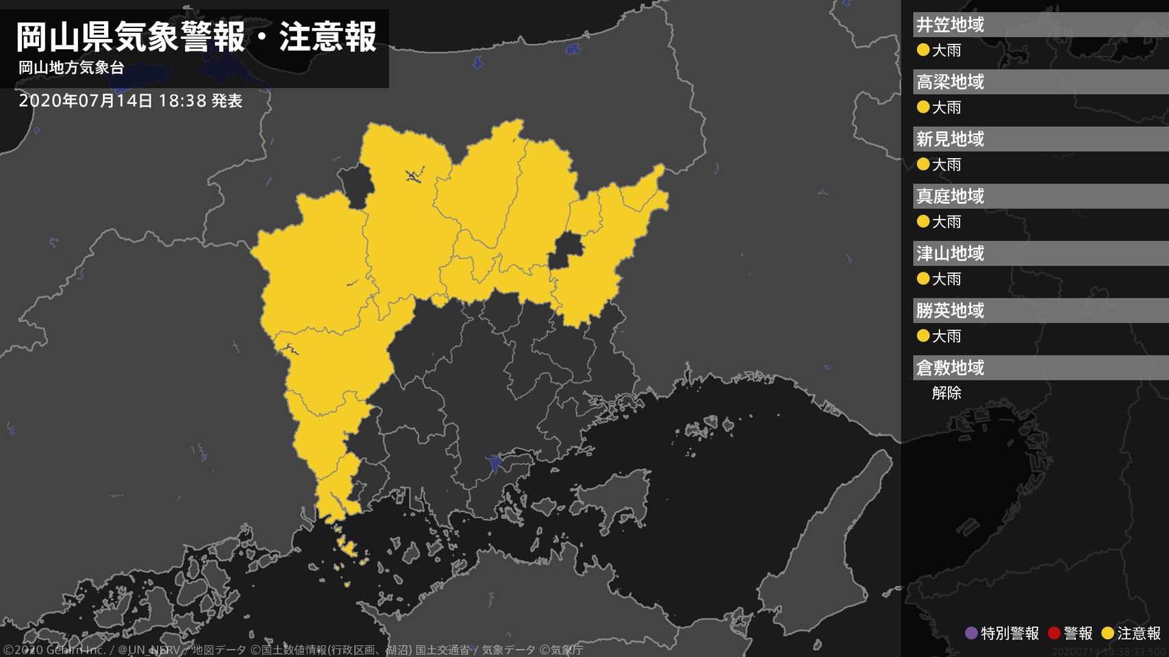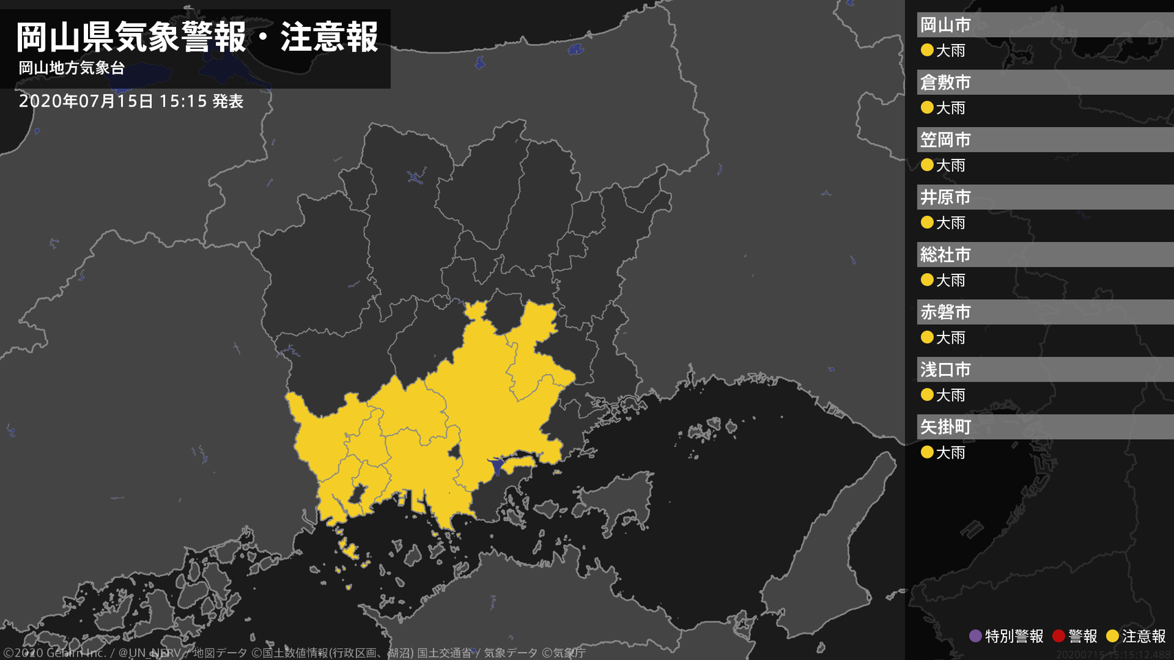 【岡山県 気象警報・注意報 2020年07月15日 08:10】注意報を解除します。#気象警報注意報 #岡山県