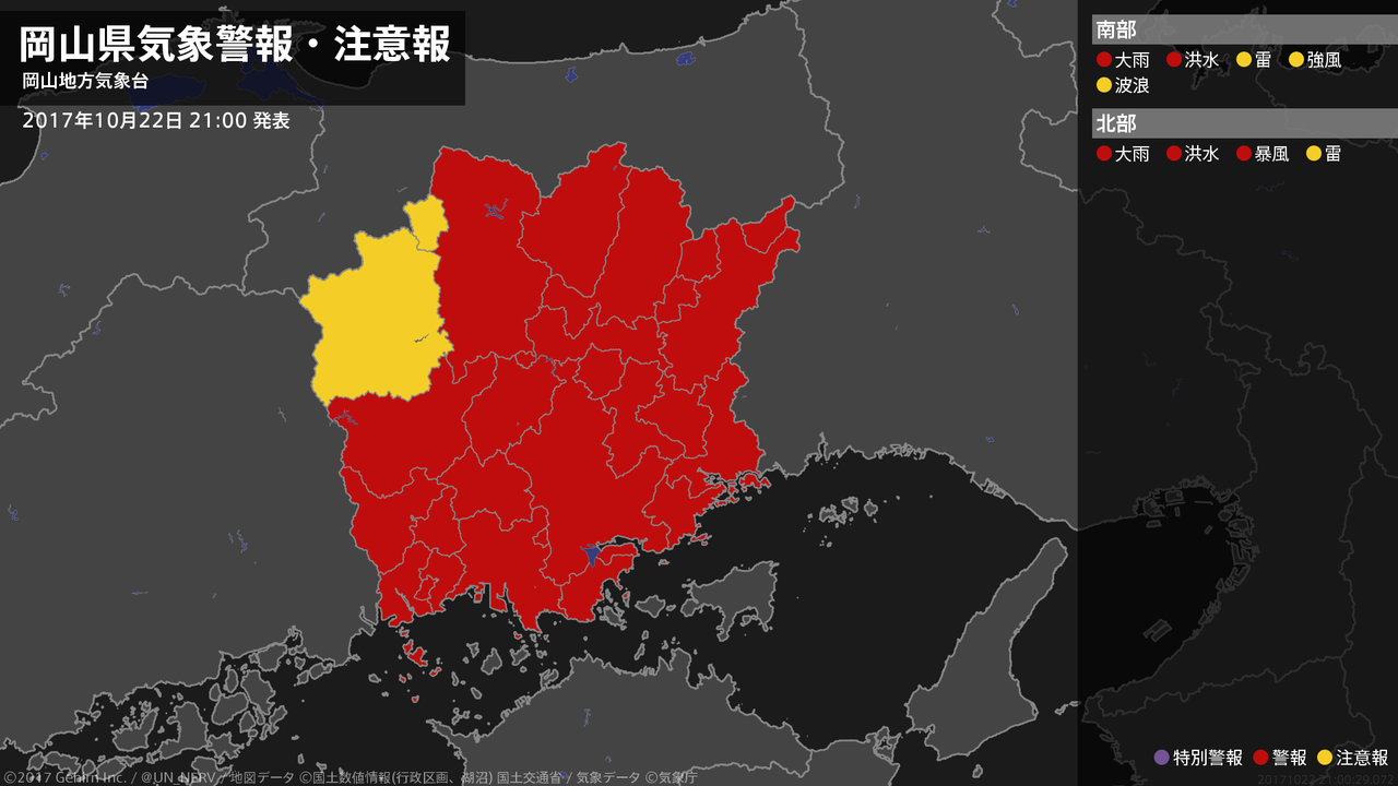 【岡山県 気象警報・注意報 2017年10月21日 21:25】岡山県では、22日朝から土砂災害に、22日明け方から強風や高波に注意してください。#気象警報注意報 #岡山県