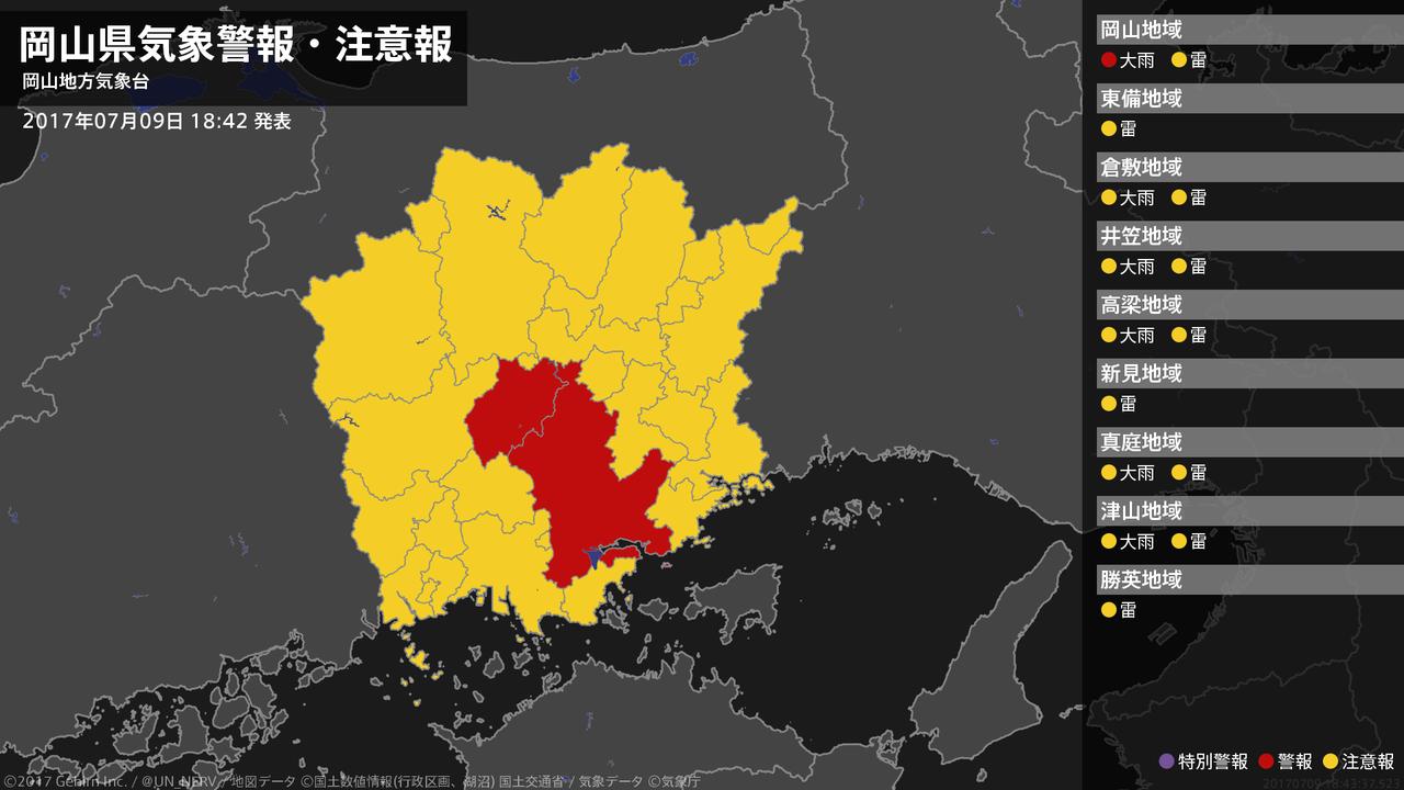 【岡山県 気象警報 2017年07月09日 18:43】南部では、9日夜のはじめ頃まで土砂災害に警戒してください。#気象警報 #気象警報注意報 #岡山県