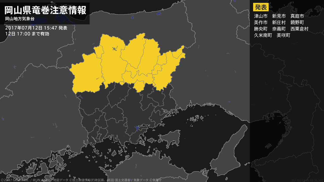 【岡山県 気象警報・注意報 2017年07月12日 04:27】岡山県では、12日夜遅くまで竜巻などの激しい突風や急な強い雨、落雷に注意してください。#気象警報注意報 #岡山県