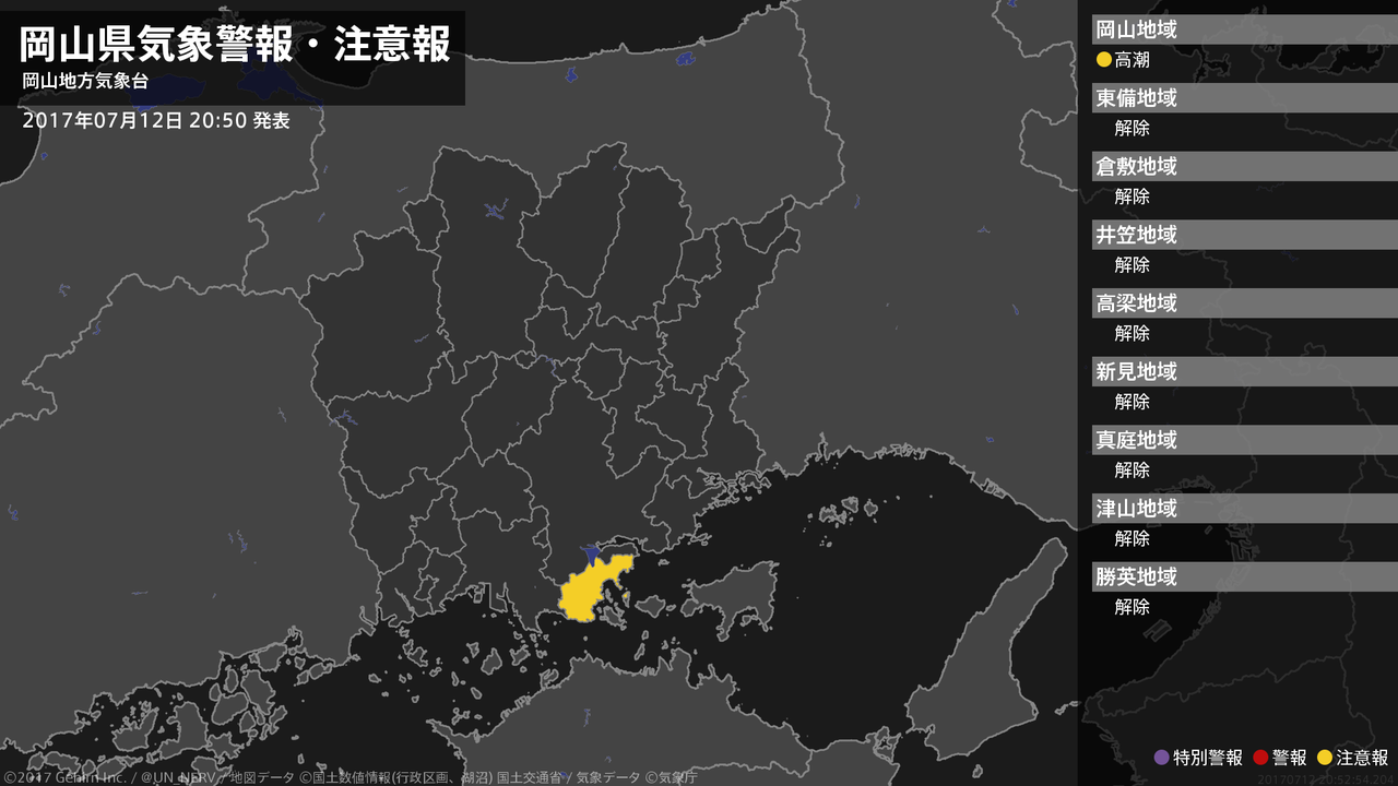 【岡山県 気象警報・注意報 2017年07月10日 20:37】注意報を解除します。#気象警報注意報 #岡山県