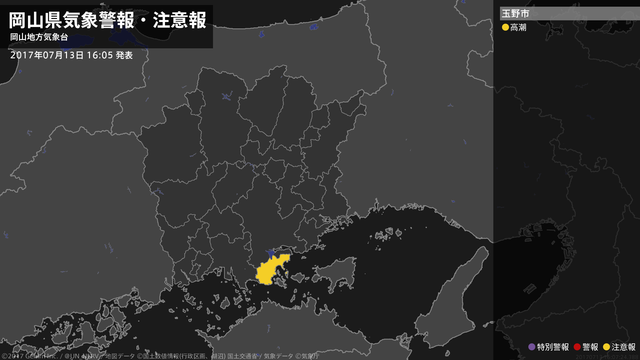 【岡山県 気象警報・注意報 2017年07月13日 16:07】南部では、14日未明から14日明け方まで高潮に注意してください。#気象警報注意報 #岡山県