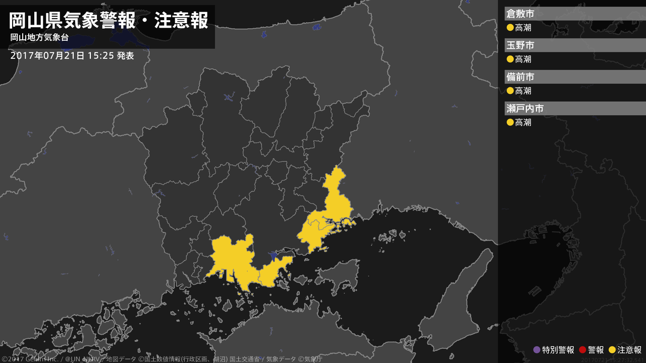 【岡山県 気象警報・注意報 2017年07月21日 15:27】南部では、21日夜遅くは高潮に注意してください。#気象警報注意報 #岡山県