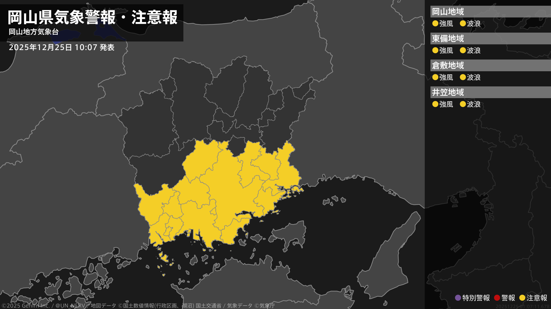 【岡山県 気象警報・注意報 2025年12月25日 10:07】南部では、25日夕方から26日昼前まで強風や高波に注意してください。#気象警報注意報 #岡山県