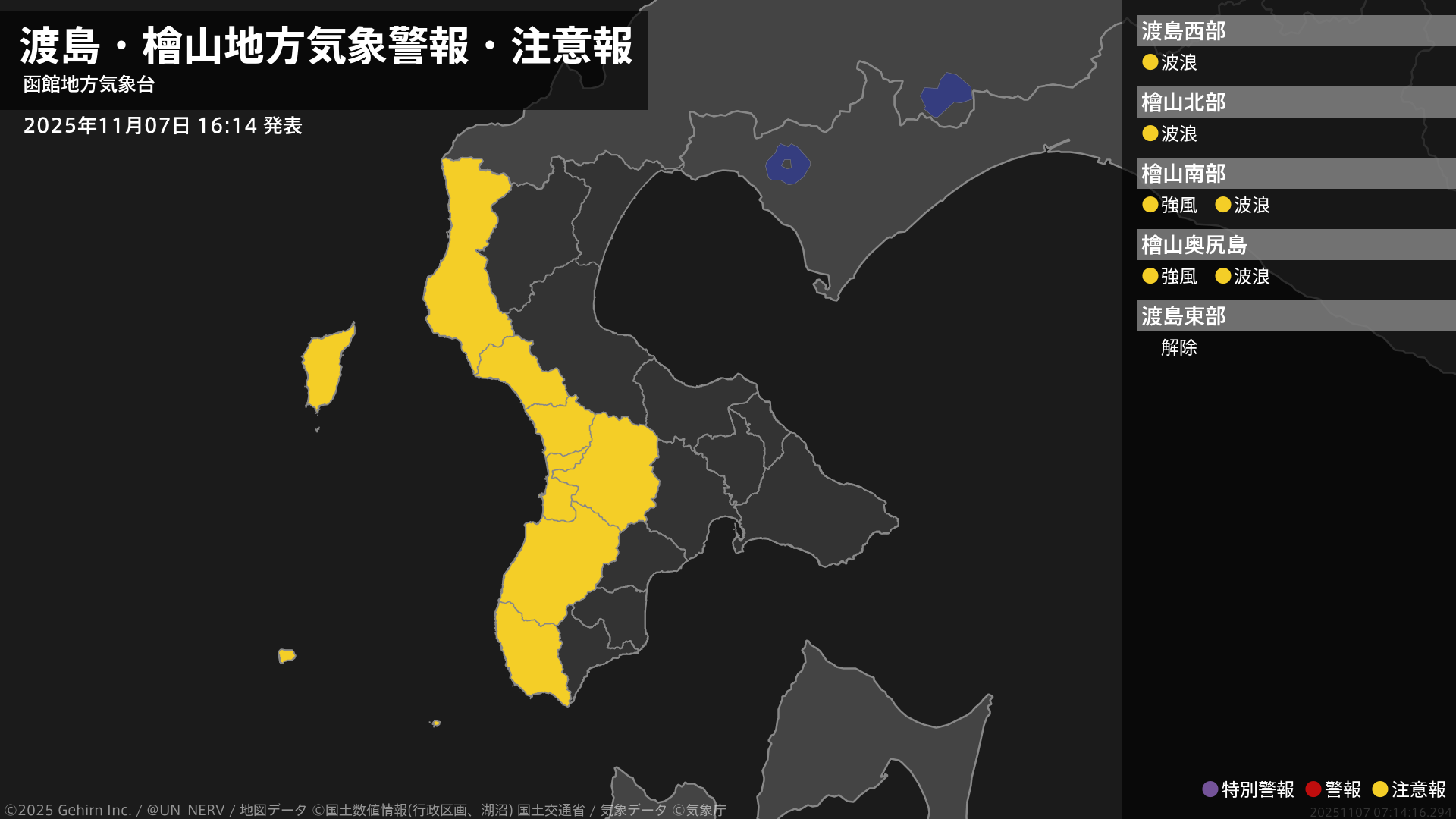 【渡島・檜山地方 気象警報・注意報 2025年11月07日 16:14】