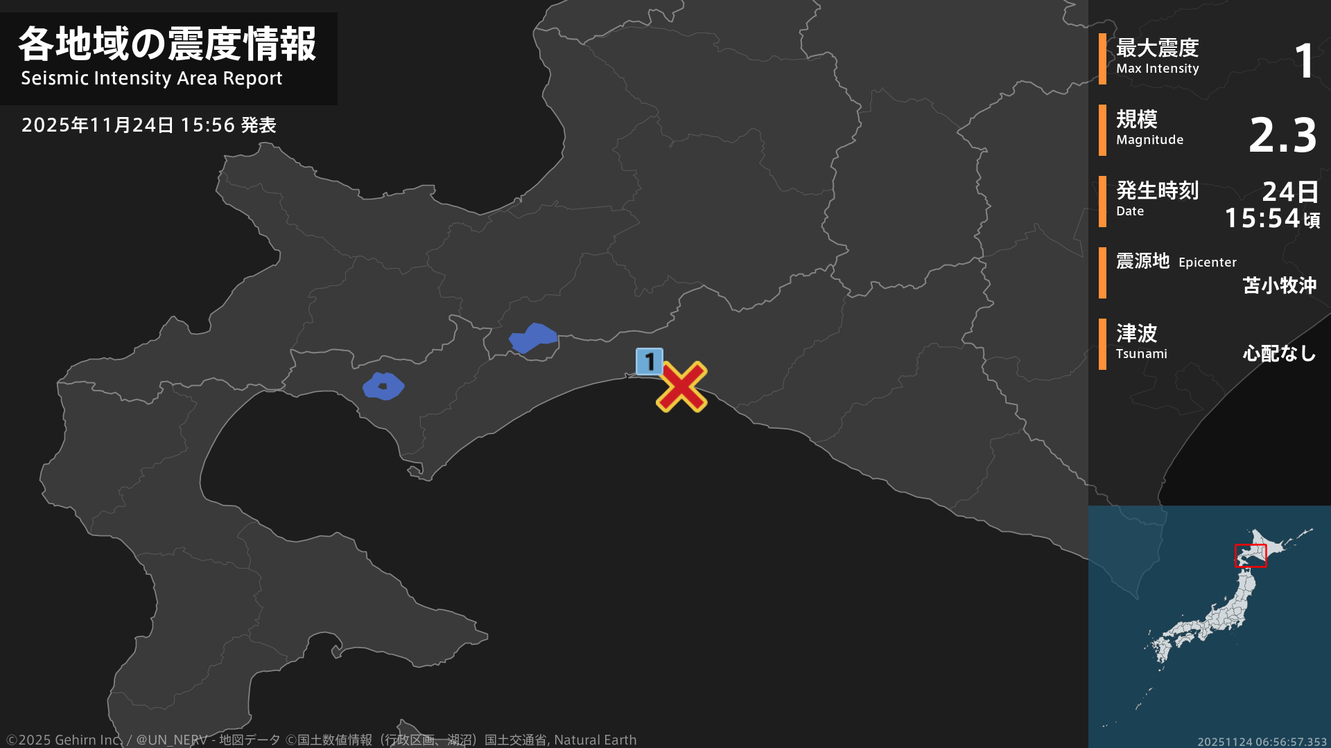 15時54分頃、苫小牧沖を震源とする地震がありました。震源の深さは約10km、地震の規模はM2.3、最大震度1を北海道で観測しています。この地震による津波の心配はありません。