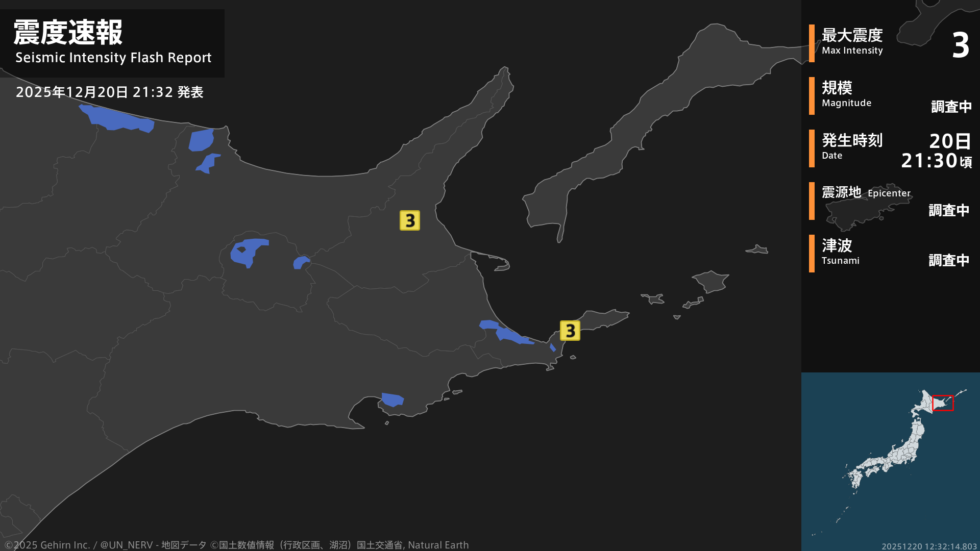 【地震情報 2025年12月20日】21時33分頃、根室半島南東沖を震源とする地震がありました。震源の深さはごく浅い、地震の規模はM5.2、最大震度3を北海道で観測しています。この地震による津波の心配はありません。#地震 #北海道