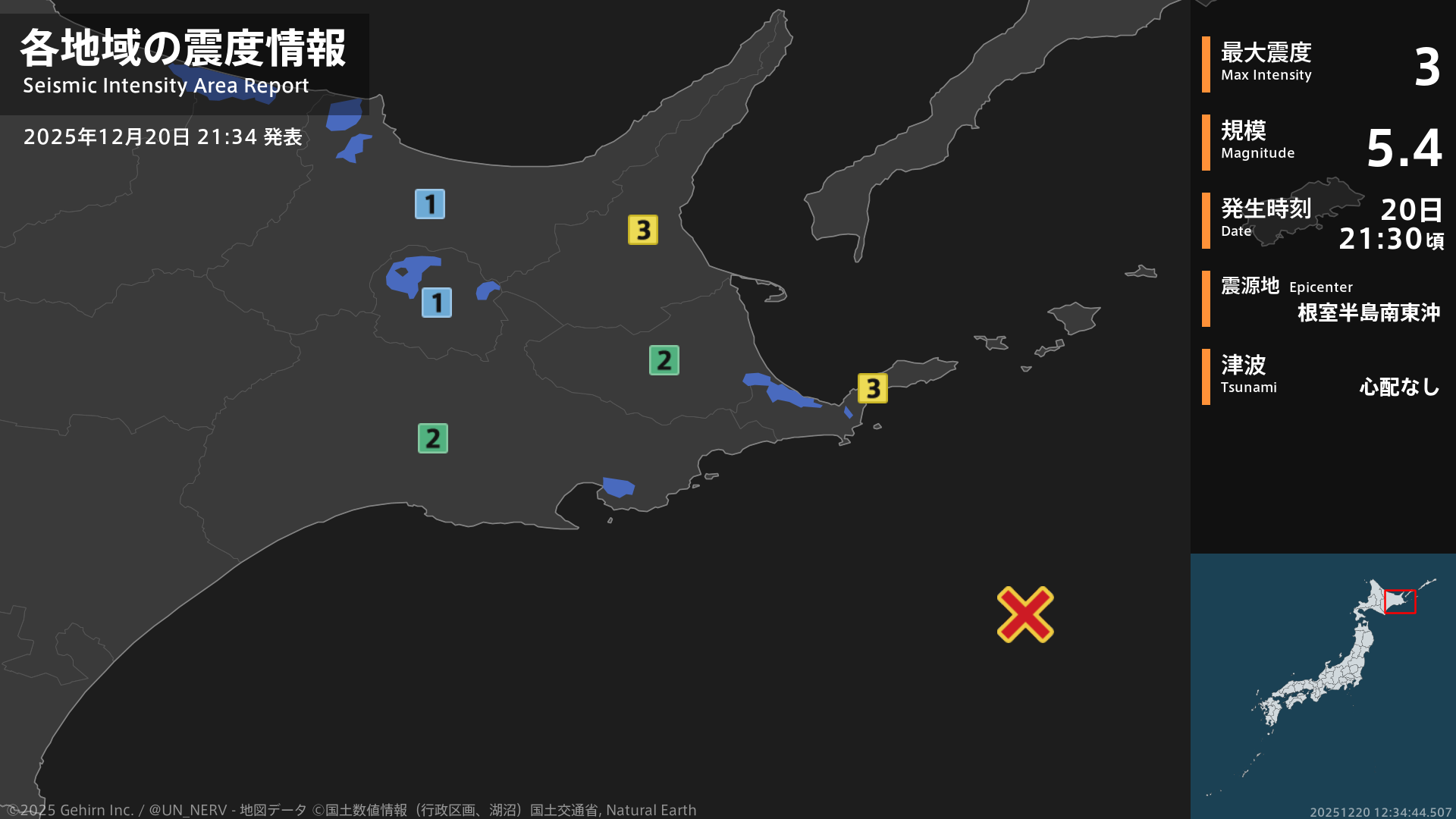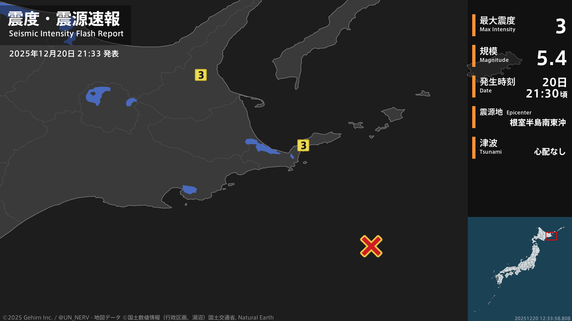 【地震情報 2025年12月20日】21時30分頃、根室半島南東沖を震源とする地震がありました。震源の深さは約10km、地震の規模はM5.4、最大震度3を北海道で観測しています。この地震による津波の心配はありません。#地震 #北海道