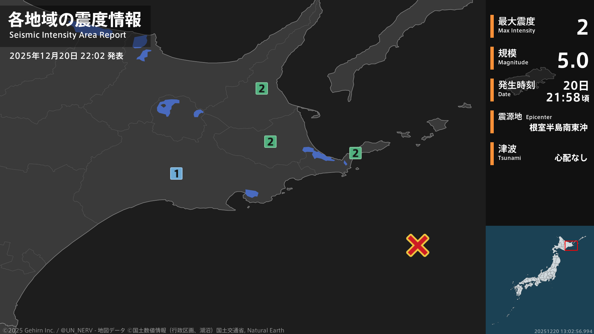 【地震情報 2025年12月20日】21時58分頃、根室半島南東沖を震源とする地震がありました。震源の深さは約10km、地震の規模はM5.0、最大震度2を北海道で観測しています。この地震による津波の心配はありません。#地震 #北海道