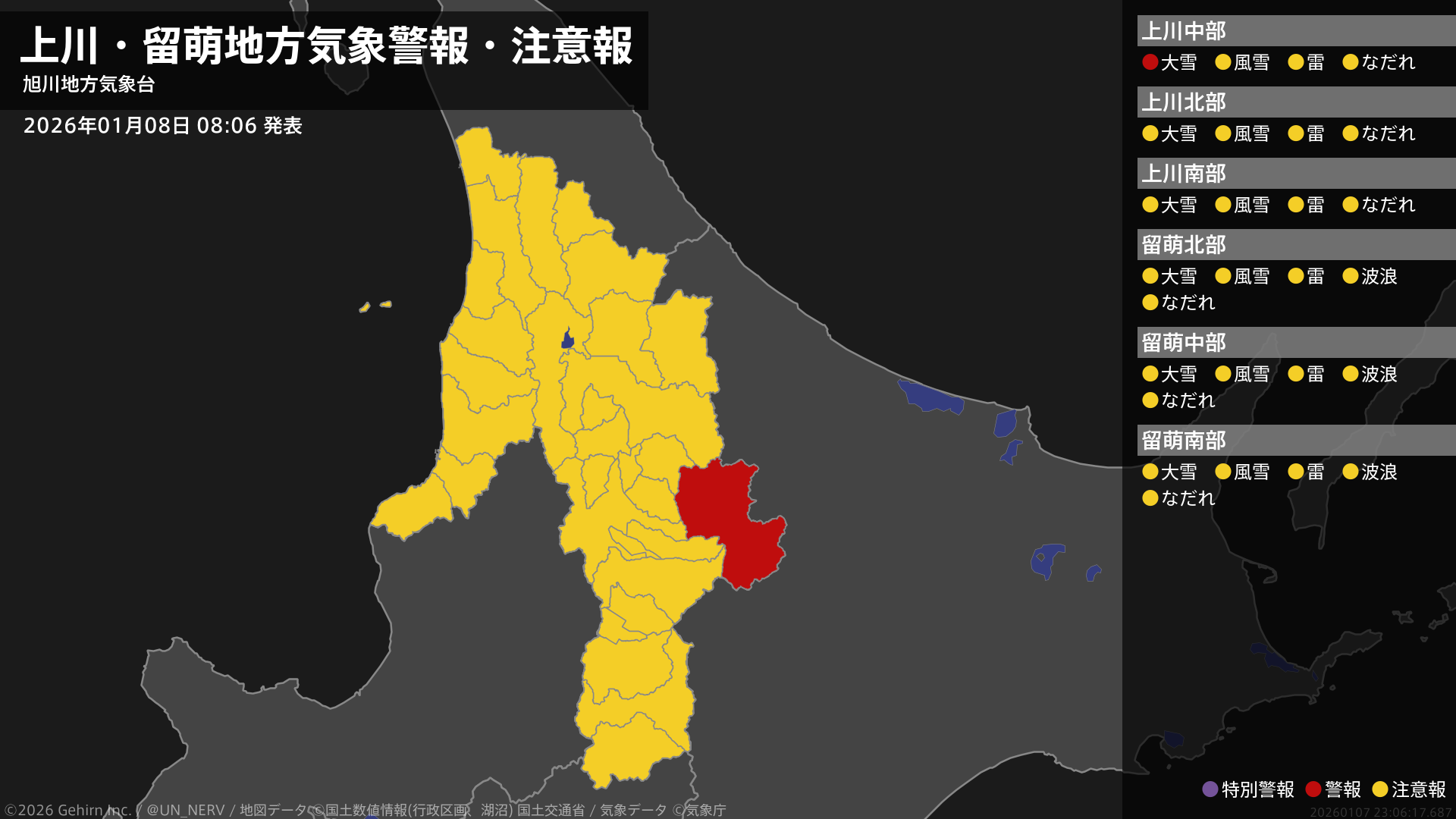 【上川・留萌地方 気象警報・注意報 2026年01月08日 08:06】上川地方では、8日昼過ぎまで大雪に警戒してください。#気象警報注意報 #上川地方 #留萌地方