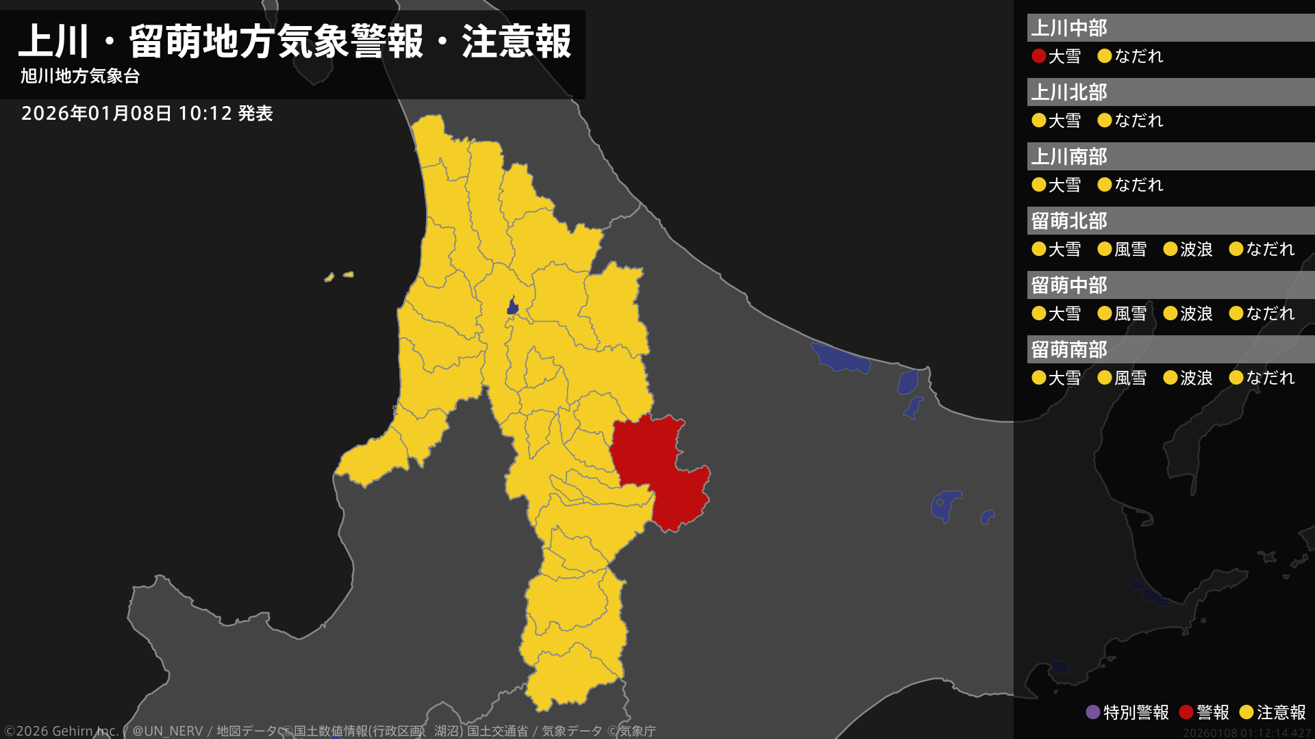 【上川・留萌地方 気象警報・注意報 2026年01月08日 10:12】上川地方では、8日昼過ぎまで大雪に警戒してください。#気象警報注意報 #上川地方 #留萌地方
