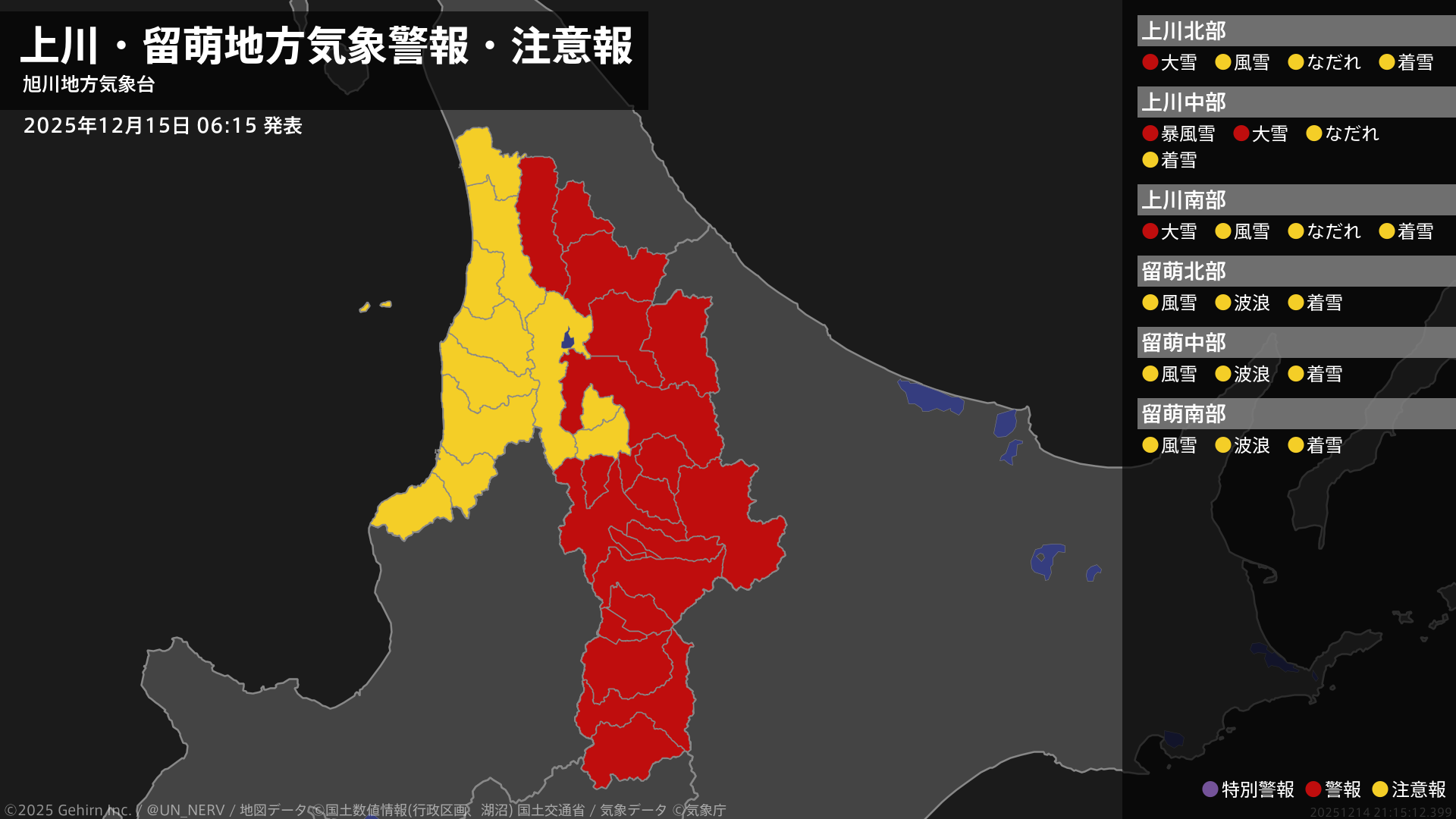 【上川・留萌地方 気象警報・注意報 2025年12月15日 06:15】上川地方では、15日昼前まで暴風雪や大雪に警戒してください。#気象警報注意報 #上川地方 #留萌地方