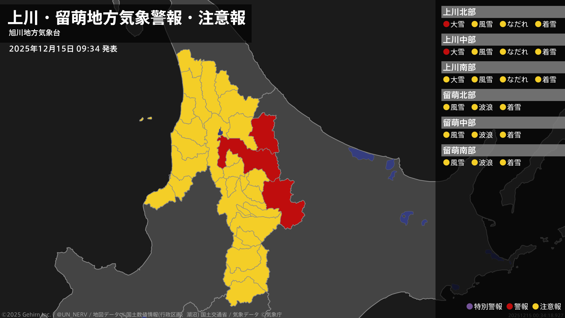 【上川・留萌地方 気象警報・注意報 2025年12月15日 09:34】上川地方では、15日昼過ぎまで大雪に警戒してください。#気象警報注意報 #上川地方 #留萌地方