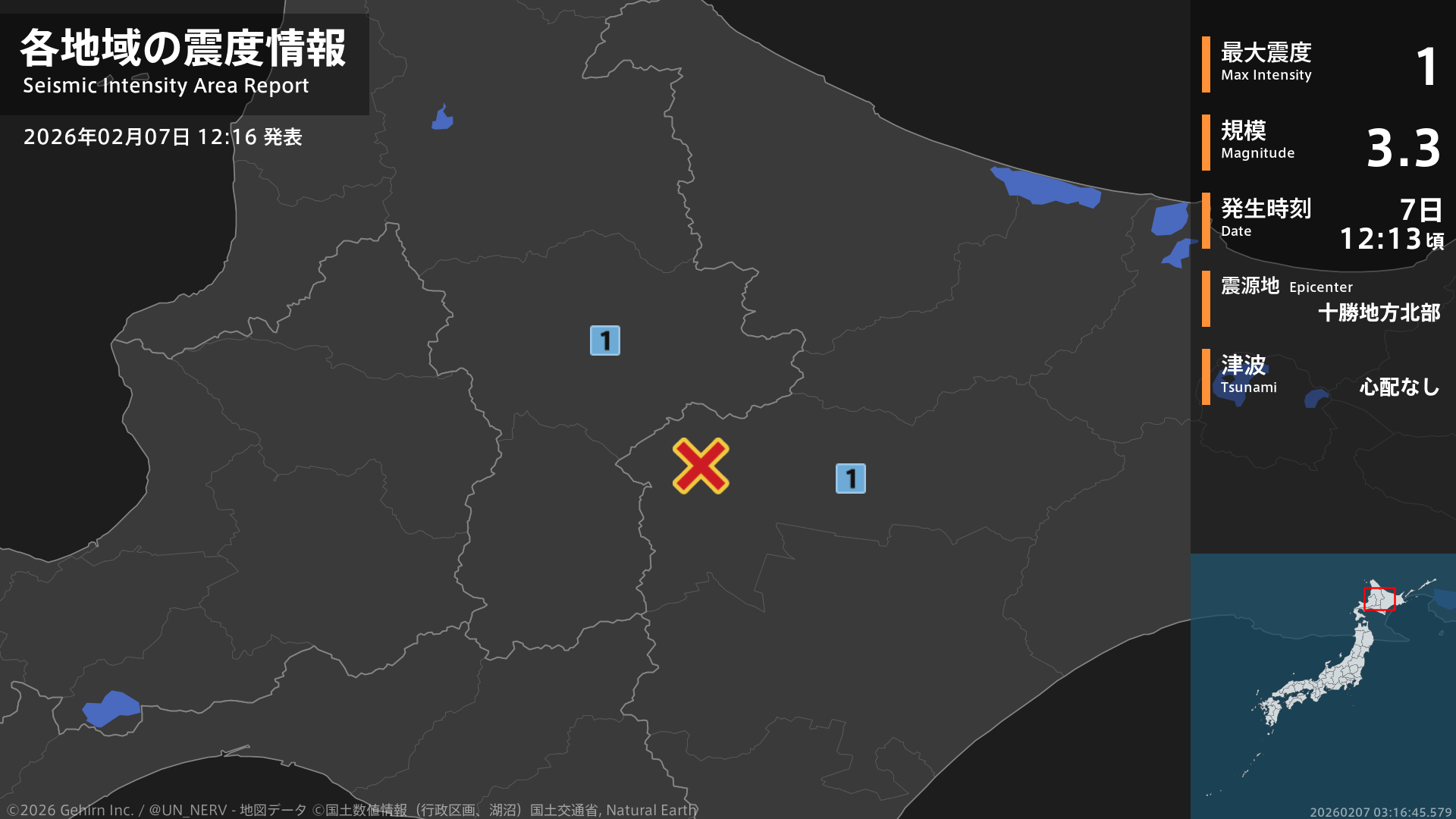 【地震情報 2026年2月7日】12時13分頃、十勝地方北部を震源とする地震がありました。震源の深さはごく浅い、地震の規模はM3.3、最大震度1を北海道で観測しています。この地震による津波の心配はありません。#地震 #北海道