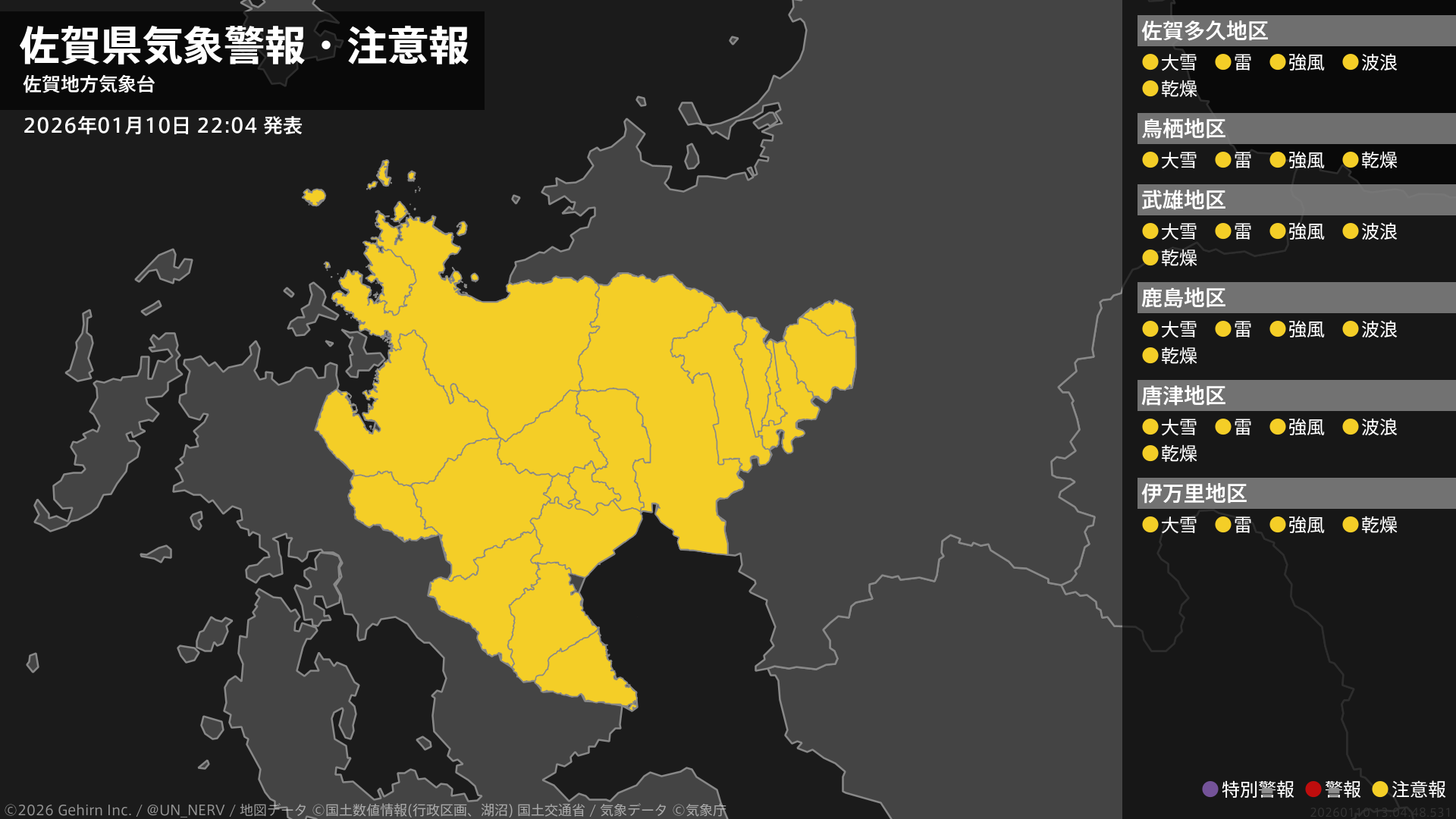 【佐賀県 気象警報・注意報 2026年01月10日 22:04】
