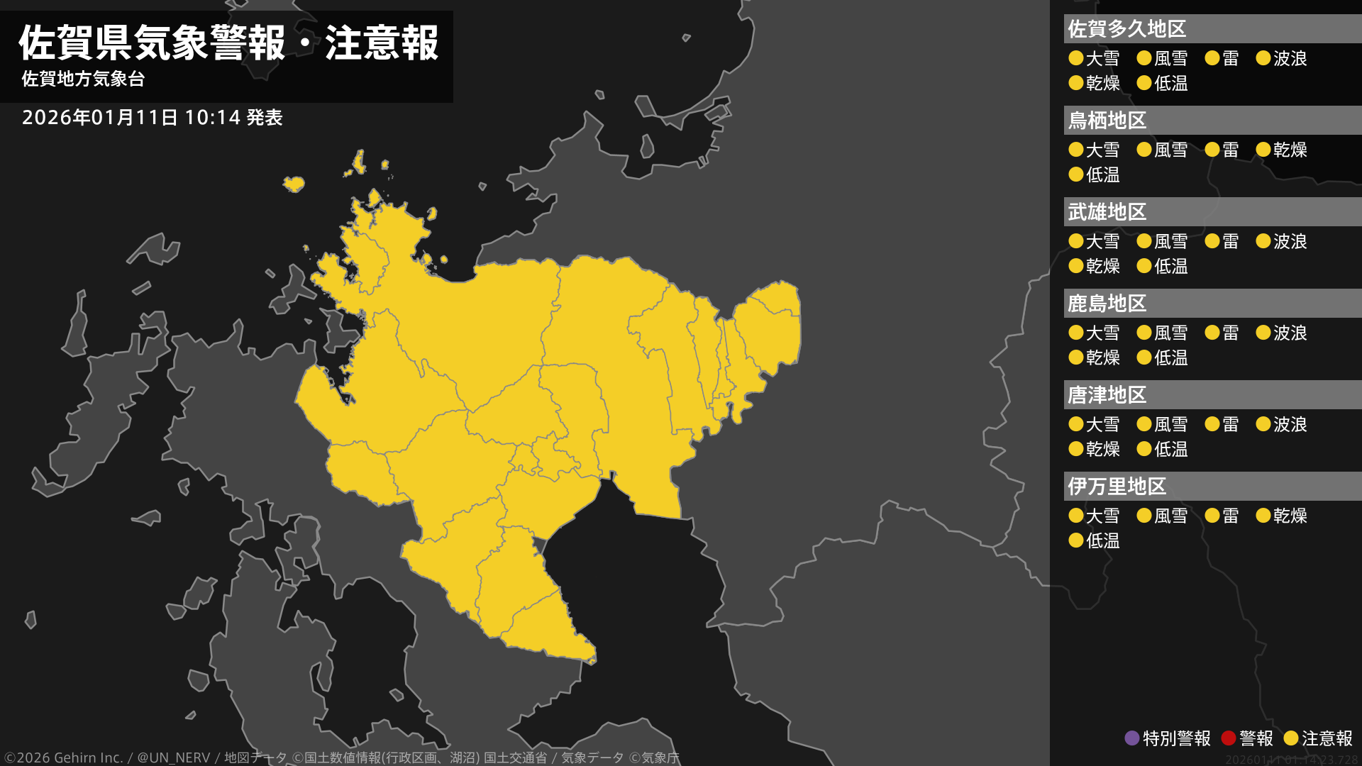 【佐賀県 気象警報・注意報 2026年01月11日 10:14】