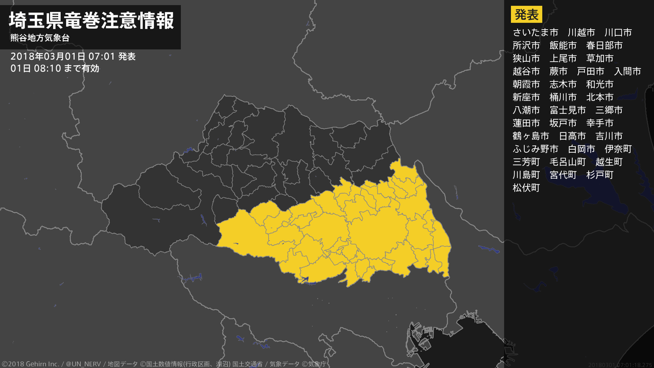 埼玉県は、竜巻などの激しい突風が発生しやすい気象状況になっています。頑丈な建物内に移動するなど安全確保に努めてください。この情報は01日08:10まで有効です。