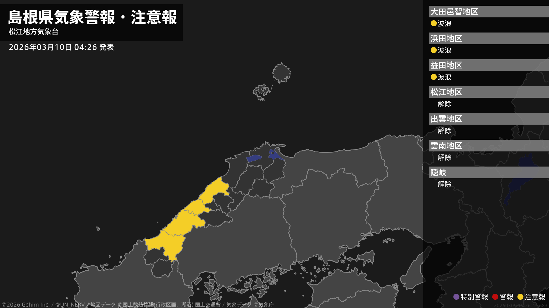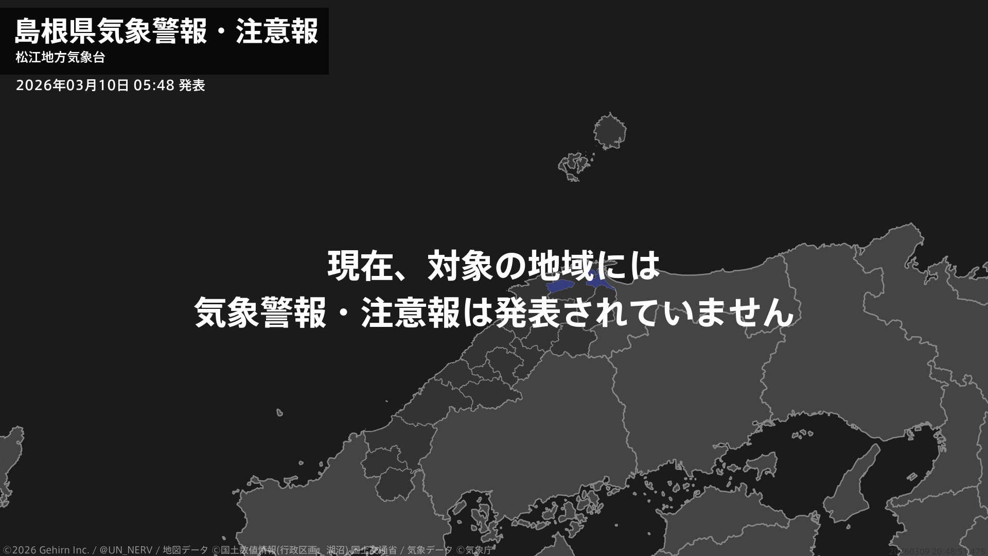 【島根県 気象警報・注意報 2026年03月10日 05:48】注意報を解除します。#気象警報注意報 #島根県