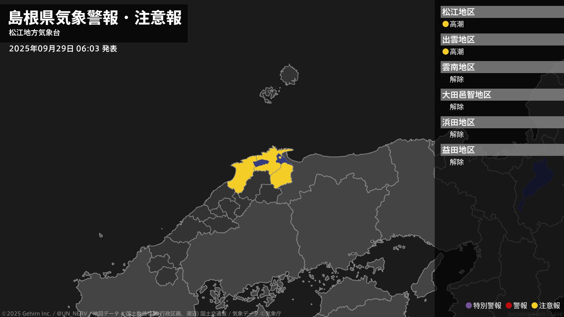 【島根県 気象警報・注意報 2025年09月29日 03:07】