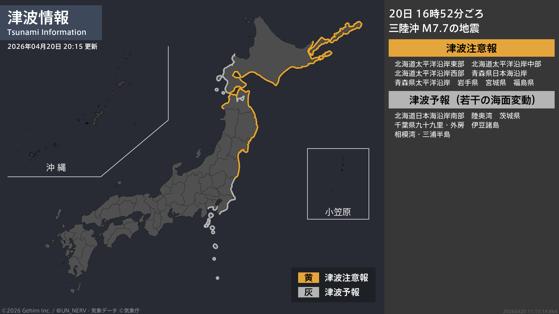 【津波情報 2026年4月20日】津波注意報に切り替えました。[震源に関する情報]16時52分頃、三陸沖を震源とする地震。震源の深さは約20km、地震の規模はM7.7と推定。#津波 #釧路地方 #根室地方 #十勝地方 #日高地方 #胆振地方 #渡島地方 #青森県 #岩手県 #宮城県 #福島県 #後志地方 #檜山地方 #茨城県 #千葉県 #東京都 #神奈川県
