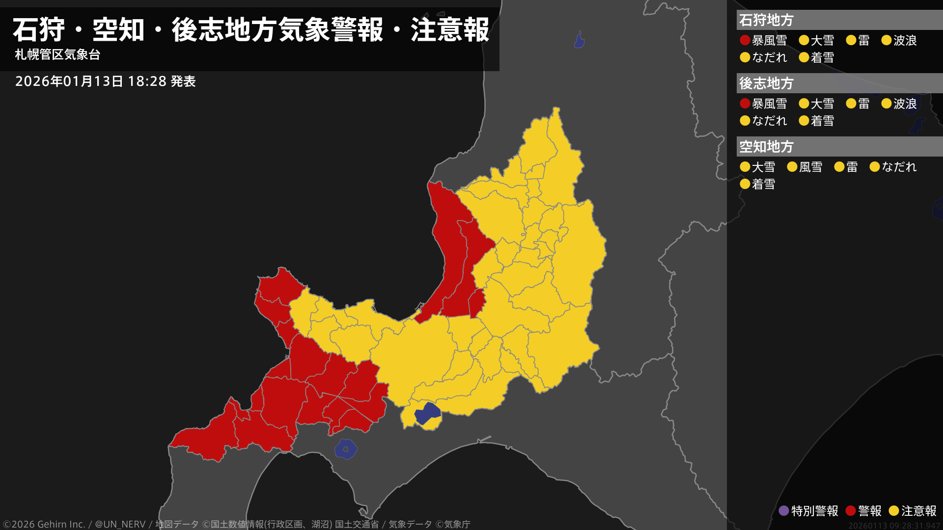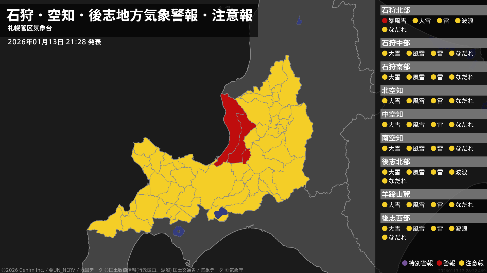 【暴風雪と高波及び雷に関する全般気象情報 2026年01月13日 16:40】