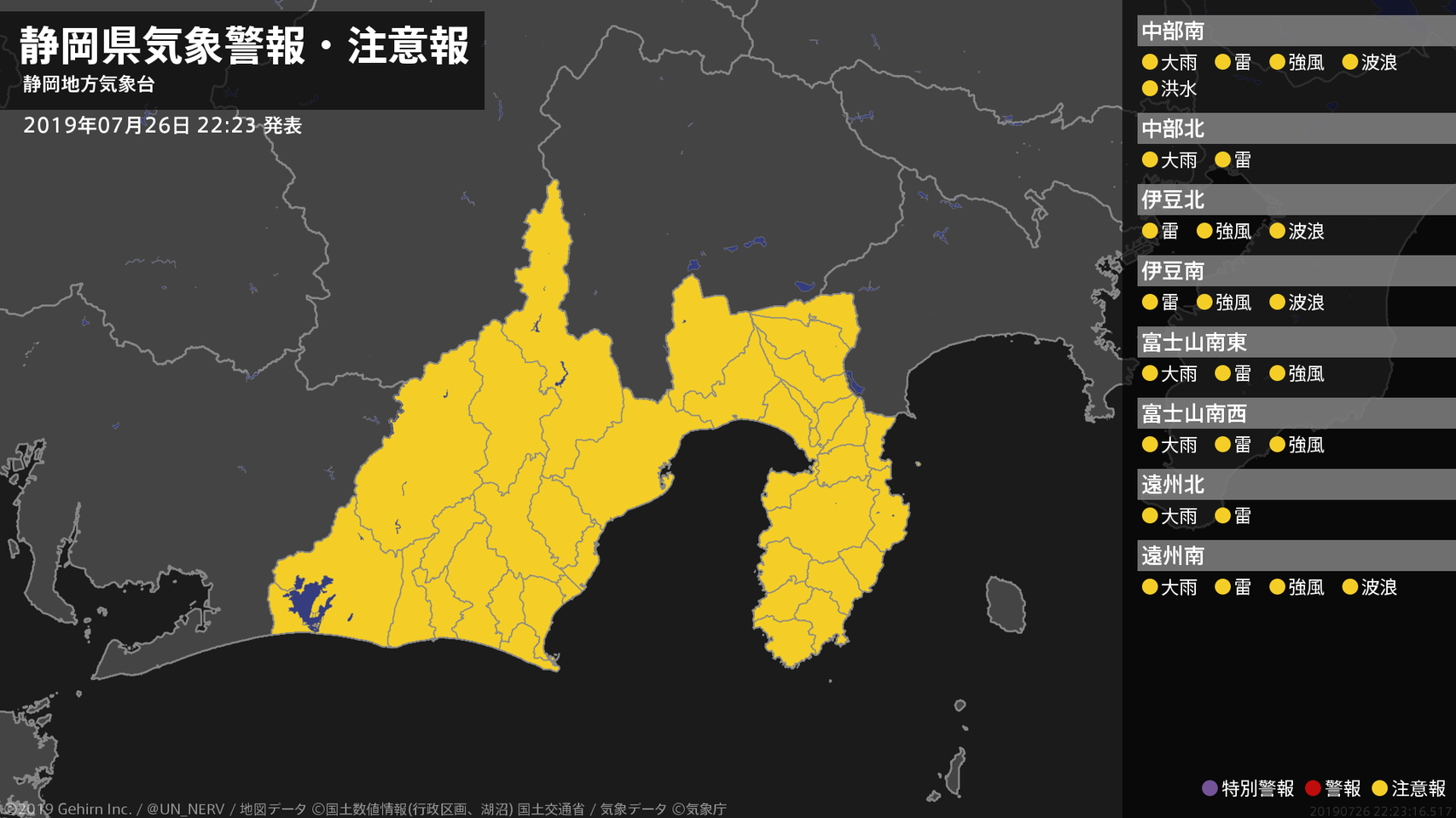 【静岡県 気象警報・注意報 2019年07月26日 22:23】