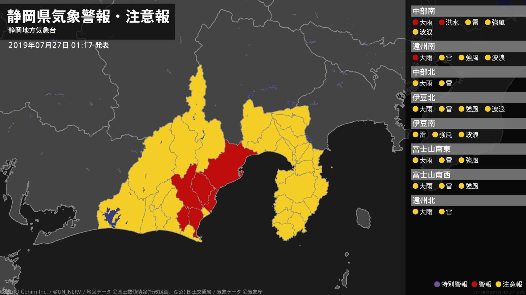 【静岡県 気象警報・注意報 2019年07月27日 01:17】