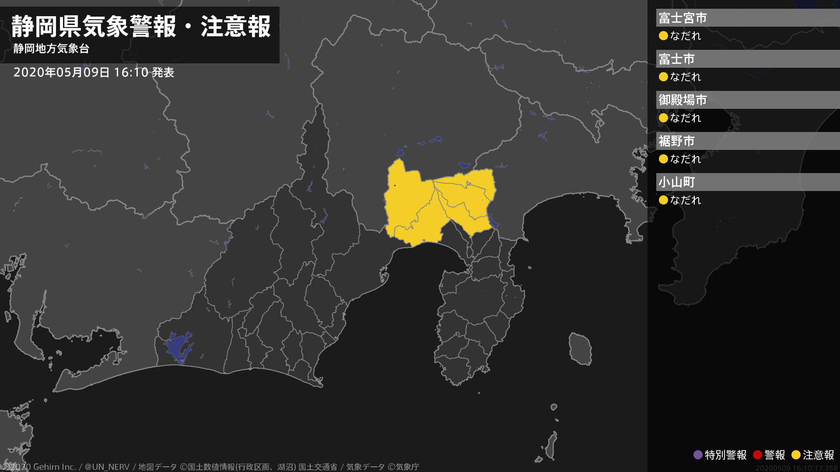 【静岡県 気象警報・注意報 2020年05月10日 22:09】静岡県では、11日未明まで急な強い雨や落雷に、11日明け方まで濃霧による視程障害に注意してください。富士山では、11日までなだれに注意してください。#気象警報注意報 #静岡県