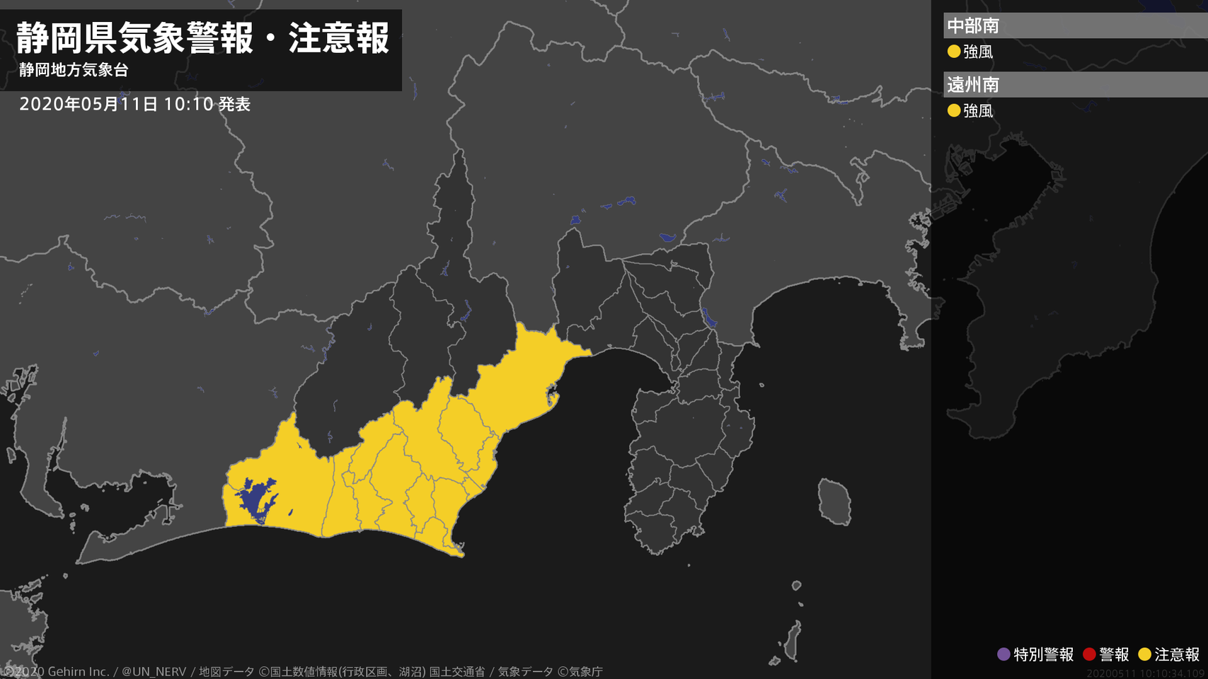 【静岡県 気象警報・注意報 2020年05月11日 10:10】中部、西部では、11日昼過ぎから11日夜のはじめ頃まで強風に注意してください。#気象警報注意報 #静岡県